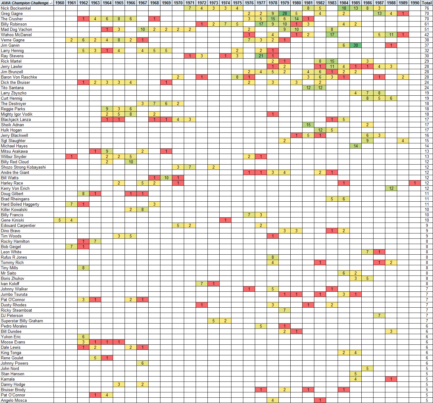 I really wanted to include some AWA in my book project. As a Saint Paul homeowner, I feel obligated. So, I've been looking at Clawmaster's AWA Results 1960 to 1964 Larry Hennig 271 matches (133-98-22, 18 other matches) = 58% win percent Doug Gilbert 258 matches (142-61-30, 25 other matches) = 70% win percent Verne Gagne 248 matches (166-39-25, 18 other matches) = 81% win percent Bob Geigel 215 matches (97-72-31, 15 other matches) = 57% win percent The Crusher 209 matches (161-25-9, 14 other matches) = 87% win percent Tiny Mills 192 matches (40-130-11, 11 other matches) = 24% win percent Krusher Stan Kowalski 159 matches (37-101-18, 3 other matches) = 27% win percent Joe Scarpello 146 matches (76-46-15, 9 other matches) = 62% win percent Bill Miller 145 matches (97-31-11, 6 other matches) = 76% win percent Moose Evans 140 matches (56-65-6, 13 other matches) = 46% win percent Hard Boiled Haggerty 140 matches (79-41-18, 2 other matches) = 66% win percent Ivan Kalmikoff 136 matches (56-41-19, 20 other matches) = 58% win percent Wilbur Snyder 134 matches (83-41-7, 3 other matches) = 67% win percent Gene Kiniski 119 matches (70-35-9, 5 other matches) = 67% win percent Blackjack Lanza 108 matches (58-39-5, 6 other matches) = 60% win percent Mitsu Arakawa 106 matches (71-29-1, 5 other matches) = 71% win percent Rene Goulet 95 matches (41-40-7, 7 other matches) = 51% win percent Karol Kalmikoff 92 matches (40-28-10, 14 other matches) = 59% win percent Dick Steinborn 88 matches (48-26-7, 7 other matches) = 65% win percent Roy McClarty 85 matches (40-31-10, 4 other matches) = 56% win percent Rocky Hamilton 82 matches (37-21-12, 12 other matches) = 64% win percent Eddie Sharkey 81 matches (38-28-7, 8 other matches) = 58% win percent Dale Lewis 80 matches (47-23-7, 3 other matches) = 67% win percent Jim Hady 77 matches (38-18-16, 5 other matches) = 68% win percent Len Montana 76 matches (36-27-8, 5 other matches) = 57% win percent Harley Race 68 matches (52-12-2, 2 other matches) = 81% win percent Jack Pesek 67 matches (24-26-12, 5 other matches) = 48% win percent Nick Roberts 63 matches (19-33-7, 4 other matches) = 37% win percent Tony Baillargeon 63 matches (31-21-10, 1 other matches) = 60% win percent Duke Hoffman 60 matches (21-30-4, 5 other matches) = 41% win percent Reggie Parks 59 matches (28-18-10, 3 other matches) = 61% win percent Mad Dog Vachon 59 matches (49-6-2, 2 other matches) = 89% win percent Maurice LaPointe 51 matches (7-38-2, 4 other matches) = 16% win percent 1965 to 1969 Larry Hennig 721 matches (372-237-38, 74 other matches) = 61% win percent Harley Race 601 matches (334-183-35, 49 other matches) = 65% win percent The Crusher 501 matches (353-93-29, 26 other matches) = 79% win percent Mad Dog Vachon 456 matches (254-131-25, 46 other matches) = 66% win percent Dr X 403 matches (218-111-18, 56 other matches) = 66% win percent Verne Gagne 398 matches (316-54-16, 12 other matches) = 85% win percent Bill Watts 346 matches (222-62-15, 47 other matches) = 78% win percent Rene Goulet 329 matches (123-133-25, 48 other matches) = 48% win percent Chris Markoff 320 matches (134-122-41, 23 other matches) = 52% win percent Reggie Parks 265 matches (134-75-37, 19 other matches) = 64% win percent Mighty Igor Vodik 262 matches (159-80-4, 19 other matches) = 67% win percent Billy Red Lyons 256 matches (144-49-13, 50 other matches) = 75% win percent Krusher Stan Kowalski 239 matches (78-120-20, 21 other matches) = 39% win percent Kenny Jay 221 matches (17-190-10, 4 other matches) = 8% win percent Butcher Vachon 203 matches (86-68-8, 41 other matches) = 56% win percent Eddie Sharkey 187 matches (74-74-26, 13 other matches) = 50% win percent The Alaskan 186 matches (104-61-11, 10 other matches) = 63% win percent Pampero Firpo 168 matches (84-45-10, 29 other matches) = 65% win percent Billy Red Cloud 159 matches (90-39-21, 9 other matches) = 70% win percent Doug Gilbert 155 matches (64-51-30, 10 other matches) = 56% win percent Red Bastien 149 matches (98-16-5, 30 other matches) = 86% win percent George Gadaski 149 matches (3-134-8, 4 other matches) = 2% win percent Luke Brown 141 matches (73-50-8, 10 other matches) = 59% win percent Lars Anderson 133 matches (74-33-8, 18 other matches) = 69% win percent Killer Kowalski 129 matches (84-26-9, 10 other matches) = 76% win percent Dick the Bruiser 126 matches (69-37-18, 2 other matches) = 65% win percent Wilbur Snyder 126 matches (74-30-17, 5 other matches) = 71% win percent Blackjack Lanza 124 matches (71-35-18, 0 other matches) = 67% win percent Bob Boyer 110 matches (25-61-19, 5 other matches) = 29% win percent Dutch Savage 99 matches (47-34-5, 13 other matches) = 58% win percent Mitsu Arakawa 92 matches (36-42-11, 3 other matches) = 46% win percent Ken Yates 91 matches (0-91-0, 0 other matches) = 0% win percent Ivan Kalmikoff 87 matches (32-47-5, 3 other matches) = 41% win percent Tiny Mills 85 matches (15-54-3, 13 other matches) = 22% win percent Mark Starr 83 matches (4-69-6, 4 other matches) = 5% win percent Chris Tolos 81 matches (53-19-2, 7 other matches) = 74% win percent Moose Cholak 81 matches (29-41-7, 4 other matches) = 41% win percent Guy Taylor 80 matches (0-78-1, 1 other matches) = 0% win percent Steve Druk 74 matches (23-42-4, 5 other matches) = 35% win percent Jack Pesek 74 matches (12-45-15, 2 other matches) = 21% win percent Jose Quintero 73 matches (2-71-0, 0 other matches) = 3% win percent Johnny Powers 72 matches (40-23-7, 2 other matches) = 63% win percent Mike Riker 71 matches (21-32-5, 13 other matches) = 40% win percent Great Dane 62 matches (1-60-0, 1 other matches) = 2% win percent Johnny Zenda 62 matches (5-57-0, 0 other matches) = 8% win percent Frankie Laine 57 matches (17-30-5, 5 other matches) = 36% win percent Santiago Acosta 56 matches (3-47-3, 3 other matches) = 6% win percent Joe Scarpello 56 matches (14-32-7, 3 other matches) = 30% win percent Danny Hodge 55 matches (36-9-5, 5 other matches) = 80% win percent Paul