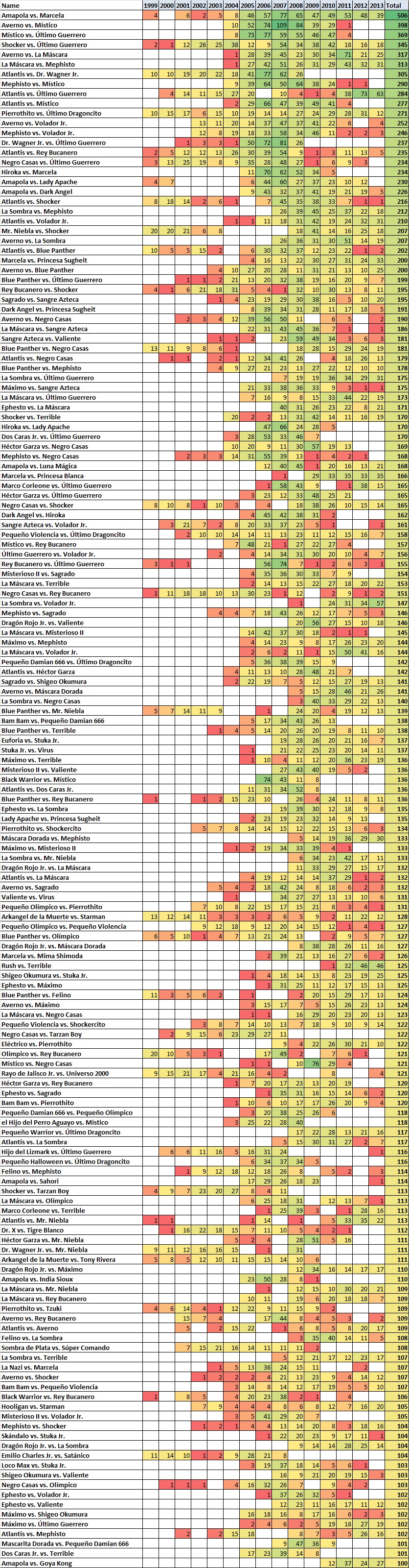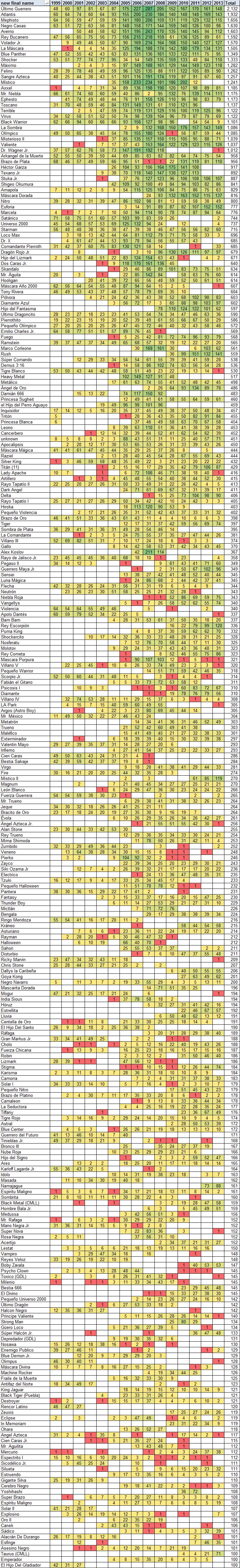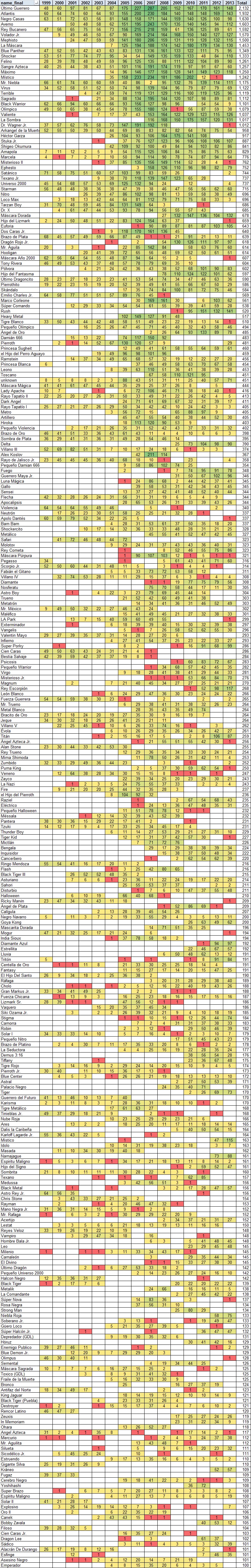 All information is extracted from http://www.thecubsfan.com/cmll/events/ Analysis by Chris Harrington (@mookieghana) This is a first pass; many gimmicks may be played by more than one wrestler. Many name changes not noted yet. CMLL data covers Jan 1999 through Nov 2013. This covers 29,845 matches that took place; about 84% were tag matches. MOST MATCHESWrestlers with 100+ Matches (Table)![]() More than 1,900 matchesÚltimo Guerrero: 2132 matches; 221 singles and 1911 tag (807-938-12 and 375 other matches = 46% win)Atlantis: 1932 matches; 133 singles and 1799 tag (898-728-6 and 300 other matches = 55% win) More than 1,500 matchesNegro Casas: 1630 matches; 103 singles and 1527 tag (739-659-11 and 221 other matches = 53% win)Averno: 1603 matches; 131 singles and 1472 tag (543-774-6 and 280 other matches = 41% win) Rey Bucanero: 1592 matches; 103 singles and 1489 tag (612-721-6 and 253 other matches = 46% win) Volador Jr.: 1570 matches; 119 singles and 1451 tag (732-565-7 and 266 other matches = 56% win) Mephisto: 1500 matches; 82 singles and 1418 tag (512-731-5 and 252 other matches = 41% win) More than 1,200 matchesLa Máscara: 1453 matches; 104 singles and 1349 tag (686-472-2 and 293 other matches = 59% win) Blue Panther: 1349 matches; 72 singles and 1277 tag (700-496-9 and 144 other matches = 59% win) Shocker: 1331 matches; 110 singles and 1221 tag (683-469-3 and 176 other matches = 59% win) Felino: 1261 matches; 52 singles and 1209 tag (509-565-4 and 183 other matches = 47% win) Sangre Azteca: 1257 matches; 80 singles and 1177 tag (425-606-1 and 225 other matches = 41% win) Máximo: 1250 matches; 70 singles and 1180 tag (554-396-1 and 299 other matches = 58% win) Místico: 1242 matches; 143 singles and 1099 tag (681-233-4 and 324 other matches = 75% win) More than 1,000 matchesMr. Niebla: 1175 matches; 59 singles and 1116 tag (516-515-3 and 141 other matches = 50% win) Virus: 1122 matches; 119 singles and 1003 tag (441-567-8 and 106 other matches = 44% win) Terrible: 1119 matches; 65 singles and 1054 tag (388-540-2 and 189 other matches = 42% win) Sagrado: 1112 matches; 51 singles and 1061 tag (518-400-4 and 190 other matches = 56% win) Black Warrior: 1101 matches; 64 singles and 1037 tag (454-505-7 and 135 other matches = 47% win) Olímpico: 1079 matches; 45 singles and 1034 tag (403-504-6 and 166 other matches = 44% win) Valiente: 1037 matches; 71 singles and 966 tag (469-372-3 and 193 other matches = 56% win) La Sombra: 1017 matches; 88 singles and 929 tag (528-324-6 and 159 other matches = 62% win) Dr. Wagner Jr.: 1012 matches; 117 singles and 895 tag (444-364-6 and 198 other matches = 55% win) More than 800 matchesArkangel de la Muerte: 958 matches; 29 singles and 929 tag (296-531 and 131 other matches = 36% win) Héctor Garza: 917 matches; 69 singles and 848 tag (399-328-1 and 189 other matches = 55% win) Stuka Jr.: 887 matches; 74 singles and 813 tag (404-322-3 and 158 other matches = 56% win) Shigeo Okumura: 841 matches; 34 singles and 807 tag (301-457 and 83 other matches = 40% win) Amapola: 829 matches; 74 singles and 755 tag (240-376-1 and 212 other matches = 39% win) More than 700 matchesMarcela: 776 matches; 82 singles and 694 tag (365-210 and 201 other matches = 63% win) Misterioso II: 762 matches; 36 singles and 726 tag (231-360 and 171 other matches = 39% win) Ephesto: 752 matches; 35 singles and 717 tag (240-387 and 125 other matches = 38% win) Satánico: 744 matches; 50 singles and 694 tag (367-309-9 and 59 other matches = 54% win) Texano Jr.: 737 matches; 32 singles and 705 tag (261-305 and 171 other matches = 46% win) Universo 2000: 737 matches; 69 singles and 668 tag (307-347-3 and 80 other matches = 47% win) Starman: 715 matches; 11 singles and 704 tag (401-257 and 57 other matches = 61% win) More than 600 matchesNitro: 696 matches; 23 singles and 673 tag (250-317 and 129 other matches = 44% win) Loco Max: 696 matches; 47 singles and 649 tag (220-384 and 92 other matches = 36% win) Tarzan Boy: 686 matches; 47 singles and 639 tag (254-329-2 and 101 other matches = 44% win) Dr. X: 685 matches; 29 singles and 656 tag (224-344 and 117 other matches = 39% win) Máscara Dorada: 678 matches; 66 singles and 612 tag (334-276-1 and 67 other matches = 55% win) Hijo del Lizmark: 659 matches; 34 singles and 625 tag (326-220-1 and 112 other matches = 60% win) Euforia: 643 matches; 43 singles and 600 tag (212-327 and 104 other matches = 39% win) Dos Caras Jr.: 640 matches; 42 singles and 598 tag (345-163-2 and 130 other matches = 68% win) Brazo de Plata: 639 matches; 24 singles and 615 tag (378-209-5 and 47 other matches = 64% win) Dragón Rojo Jr.: 618 matches; 56 singles and 562 tag (236-292-1 and 89 other matches = 45% win) Mr. Águila: 614 matches; 38 singles and 576 tag (204-285 and 125 other matches = 42% win) Hooligan: 614 matches; 12 singles and 602 tag (240-311 and 63 other matches = 44% win) Máscara Año 2000: 607 matches; 22 singles and 585 tag (244-294-3 and 66 other matches = 45% win) Tony Rivera: 603 matches; 41 singles and 562 tag (304-218-3 and 78 other matches = 58% win) Pólvora: 602 matches; 60 singles and 542 tag (204-351 and 47 other matches = 37% win) More than 500 matchesHijo del Fantasma: 597 matches; 48 singles and 549 tag (289-224-2 and 82 other matches = 56% win)Último Dragoncito: 589 matches; 36 singles and 553 tag (314-158 and 117 other matches = 67% win) Pierrothito: 586 matches; 48 singles and 538 tag (205-265-1 and 115 other matches = 44% win) Skándalo: 584 matches; 23 singles and 561 tag (190-275-1 and 118 other matches = 41% win) Emilio Charles Jr.: 569 matches; 30 singles and 539 tag (220-288-4 and 57 other matches = 43% win) Marco Corleone: 561 matches; 27 singles and 534 tag (288-161-1 and 111 other matches = 64% win) Súper Comando: 538 matches; 14 singles and 524 tag (166-322-1 and 49 other matches = 34% win) Rush: 520 matches; 50 singles and 470 tag (297-174 and 49 other matches = 63% win) Heavy Metal: 517 matches; 21 singles and 496 tag