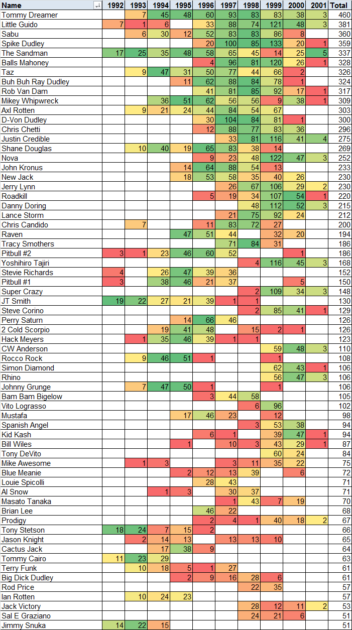 ECW: Eastern Championship Wrestling (1992-1994) and Extreme Championship Wrestling Results (1994-2001) - statistics tabulated from results garnished by The History of WWE ALL-TIME (1992-2001)TOTAL MATCHESMore than 400 matchesTommy Dreamer: 456 matches = 227 singles and 229 tag matches = 66% win (289-148-19) More than 300 matches Little Guido: 381 matches = 182 singles and 198 tag matches; won 1 rumble = 34% win (129-246-6) Spike Dudley: 359 matches = 219 singles and 136 tag matches; won 4 rumbles = 50% win (175-175-9) Sabu: 358 matches = 243 singles and 114 tag matches; won 1 rumble = 81% win (261-61-36) The Sandman: 336 matches = 219 singles and 117 tag matches = 53% win (168-149-19) Balls Mahoney: 326 matches = 112 singles and 214 tag matches = 49% win (155-163-8) Taz: 325 matches = 271 singles and 52 tag matches; won 2 rumbles = 85% win (253-45-27) Buh Buh Ray Dudley: 321 matches = 63 singles and 258 tag matches = 54% win (167-145-9) Rob Van Dam: 315 matches = 210 singles and 105 tag matches = 78% win (225-63-27) Mikey Whipwreck: 309 matches = 218 singles and 89 tag matches; won 2 rumbles = 49% win (148-156-5) Axl Rotten: 303 matches = 98 singles and 205 tag matches = 52% win (153-140-10) More than 200 matches D-Von Dudley: 299 matches = 55 singles and 243 tag matches; won 1 rumble = 46% win (135-158-6) Chris Chetti: 296 matches = 143 singles and 153 tag matches = 42% win (119-166-11) Justin Credible: 275 matches = 191 singles and 84 tag matches = 47% win (124-141-10) Shane Douglas: 267 matches = 189 singles and 78 tag matches = 65% win (164-88-15) Nova: 252 matches = 89 singles and 163 tag matches = 56% win (135-105-12) John Kronus: 232 matches = 58 singles and 174 tag matches = 62% win (141-85-6) Jerry Lynn: 230 matches = 177 singles and 53 tag matches = 57% win (127-96-7) New Jack: 230 matches = 58 singles and 172 tag matches = 64% win (142-81-7) Roadkill: 219 matches = 42 singles and 177 tag matches = 42% win (91-125-3) Danny Doring: 215 matches = 35 singles and 180 tag matches = 46% win (97-113-5) Lance Storm: 211 matches = 133 singles and 78 tag matches = 53% win (108-94-9) More than 130 matches Chris Candido: 199 matches = 121 singles and 78 tag matches = 61% win (113-73-13) Raven: 193 matches = 100 singles and 93 tag matches = 61% win (113-73-7) Pitbull #2: 186 matches = 60 singles and 126 tag matches = 48% win (83-90-13) Tracy Smothers: 186 matches = 47 singles and 139 tag matches = 35% win (64-117-5) Yoshihiro Tajiri: 168 matches = 141 singles and 27 tag matches = 52% win (86-80-2) Stevie Richards: 151 matches = 92 singles and 57 tag matches; won 2 rumbles = 36% win (52-93-6) Pitbull #1: 150 matches = 22 singles and 128 tag matches = 42% win (60-84-6) Super Crazy: 148 matches = 127 singles and 21 tag matches = 58% win (86-62-0) JT Smith: 130 matches = 69 singles and 59 tag matches; won 2 rumbles = 48% win (58-64-8) More than 110 matches Steve Corino: 129 matches = 96 singles and 33 tag matches = 33% win (41-84-4) 2 Cold Scorpio: 126 matches = 94 singles and 31 tag matches; won 1 rumble = 50% win (55-54-17) Perry Saturn: 125 matches = 11 singles and 114 tag matches = 70% win (86-36-3) Hack Meyers: 123 matches = 85 singles and 38 tag matches = 28% win (34-86-3) CW Anderson: 110 matches = 46 singles and 64 tag matches = 14% win (15-93-2) More than 100 matches Rocco Rock: 108 matches = 5 singles and 103 tag matches = 74% win (73-26-9) Rhino: 106 matches = 77 singles and 29 tag matches = 47% win (49-56-1) Johnny Grunge: 106 matches = 4 singles and 102 tag matches = 76% win (74-23-9) Simon Diamond: 106 matches = 59 singles and 47 tag matches = 20% win (21-83-2) Bam Bam Bigelow: 104 matches = 75 singles and 29 tag matches = 74% win (72-25-7) Vito Lograsso: 102 matches = 69 singles and 33 tag matches = 33% win (29-60-13) More than 90 matches Mustafa: 98 matches = 14 singles and 84 tag matches = 49% win (44-46-8) Kid Kash: 95 matches = 52 singles and 43 tag matches = 51% win (45-44-6) Spanish Angel: 94 matches = 41 singles and 53 tag matches = 15% win (13-73-8) More than 70 matches Bill Wiles: 87 matches = 30 singles and 57 tag matches = 10% win (8-76-3) Tony DeVito: 84 matches = 21 singles and 63 tag matches = 10% win (8-71-5) Mike Awesome: 75 matches = 67 singles and 8 tag matches = 80% win (59-15-1) Blue Meanie: 72 matches = 27 singles and 45 tag matches = 42% win (27-38-7) Al Snow: 71 matches = 64 singles and 7 tag matches = 68% win (48-23-0) Louie Spicolli: 71 matches = 61 singles and 10 tag matches = 42% win (29-40-2) More than 60 matches Masato Tanaka: 69 matches = 42 singles and 26 tag matches; won 1 rumble = 75% win (49-16-4) Brian Lee: 68 matches = 38 singles and 30 tag matches = 47% win (30-34-4) Prodigy: 67 matches = 51 singles and 16 tag matches = 16% win (9-49-9) Tony Stetson: 66 matches = 38 singles and 28 tag matches = 41% win (24-35-7) Jason Knight: 65 matches = 45 singles and 20 tag matches = 32% win (21-44-0) Cactus Jack: 64 matches = 39 singles and 25 tag matches = 53% win (32-28-4) Tommy Cairo: 63 matches = 43 singles and 19 tag matches; won 1 rumble = 52% win (31-29-3) Big Dick Dudley: 61 matches = 17 singles and 44 tag matches = 44% win (26-33-2) Terry Funk: 60 matches = 39 singles and 21 tag matches = 74% win (40-14-6) More than 50 matches Ian Rotten: 57 matches = 22 singles and 35 tag matches = 44% win (24-31-2) Rod Price: 57 matches = 31 singles and 26 tag matches = 29% win (15-37-5) Jack Victory: 53 matches = 14 singles and 39 tag matches = 13% win (7-45-1) Sal E Graziano: 51 matches = 31 singles and 20 tag matches = 18% win (9-41-1) Jimmy Snuka: 51 matches = 35 singles and 14 tag matches; won 2 rumbles = 67% win (33-16-2) More than 40 matches Jazz: 47 matches = 28 singles and 19 tag matches = 59% win (27-19-1) Tommy Rogers: 47 matches = 27 singles and 20 tag matches = 43% win (20-27-0) Paul Diamond: 45 matches = 29 singles and 16 tag matches = 29% win (13-32-0) Rockin Rebel: 44 matches = 30 singles and 14 tag matches = 31% win (13-29-2) Johnny Hot Body