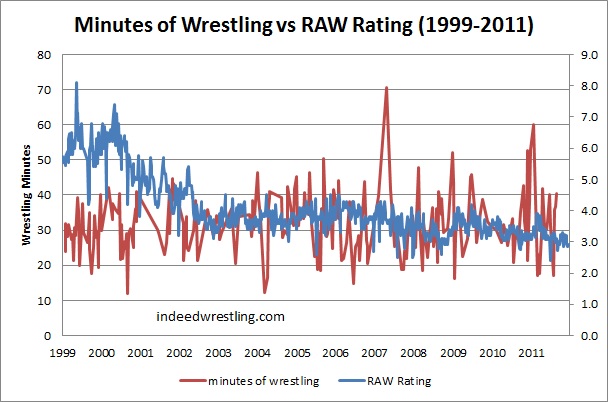 Average show in 1999 had 28 minutes 54 seconds of wrestling over 7.5 matches. (Three shows had less than 20 minutes and four shows had more than 35 minutes. Shows sampled had between 6 and 10 matches). For a two-hour RAW (I'll ignore the overrun), that's 24% of the time that was wrestling content. (Granted, with commercials I think a one-hour show is something like 39-42 minutes of content.) To compare, I took a sample of 10-20 RAWs from 2000 to 2011 (210 RAWs total covering 1,504 matches) where I had match times for all the matches I'd listed for that RAW show. Annual Averages 1999: 32 shows (28:54 minutes of wrestling average) 2000: 21 shows (30:58 minutes of wrestling average) 2001: 11 shows (34:36 minutes of wrestling average) 2002: 13 shows (29:23 minutes of wrestling average) 2003: 12 shows (32:15 minutes of wrestling average) 2004: 17 shows (33:13 minutes of wrestling average) 2005: 27 shows (32:46 minutes of wrestling average) 2006: 18 shows (28:33 minutes of wrestling average) 2007: 14 shows (32:22 minutes of wrestling average) 2008: 23 shows (32:21 minutes of wrestling average) 2009: 19 shows (34:18 minutes of wrestling average) 2010: 18 shows (31:38 minutes of wrestling average) 2011: 17 shows (33:22 minutes of wrestling average) So, 1999 was nominally lower in terms of wrestling content than following years, but this could be due to some sample bias. |