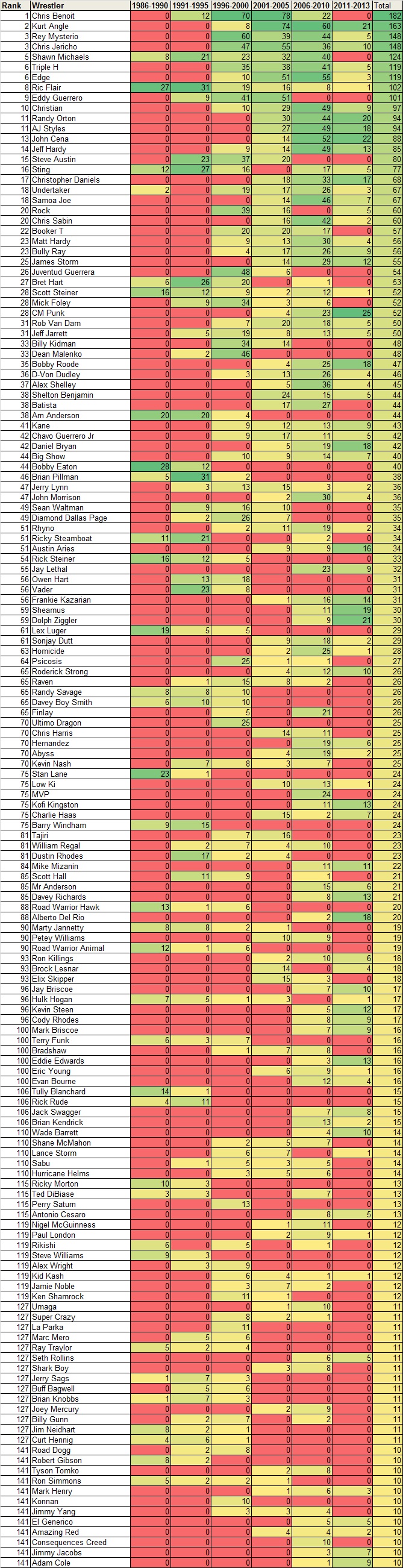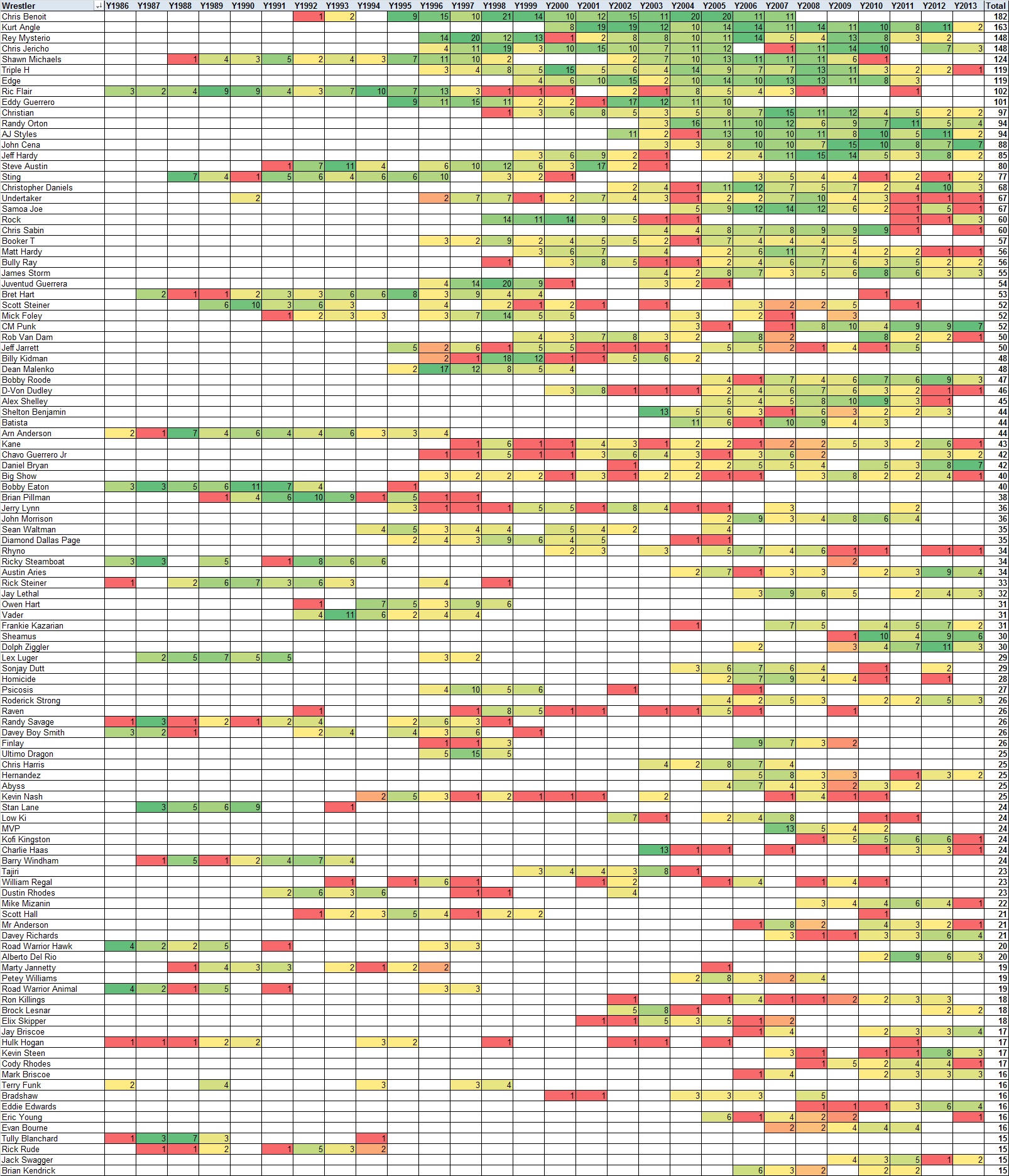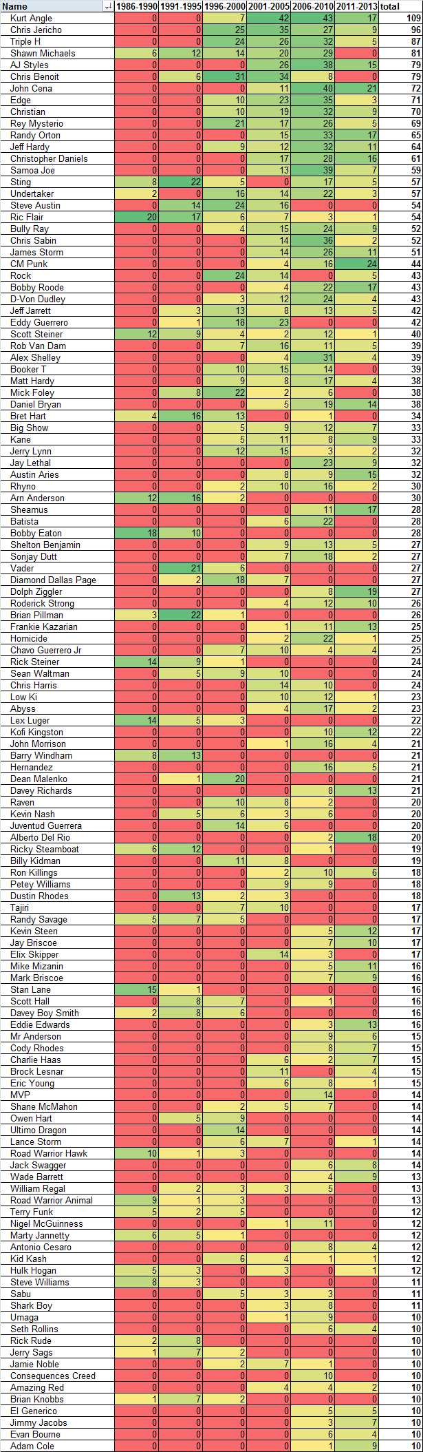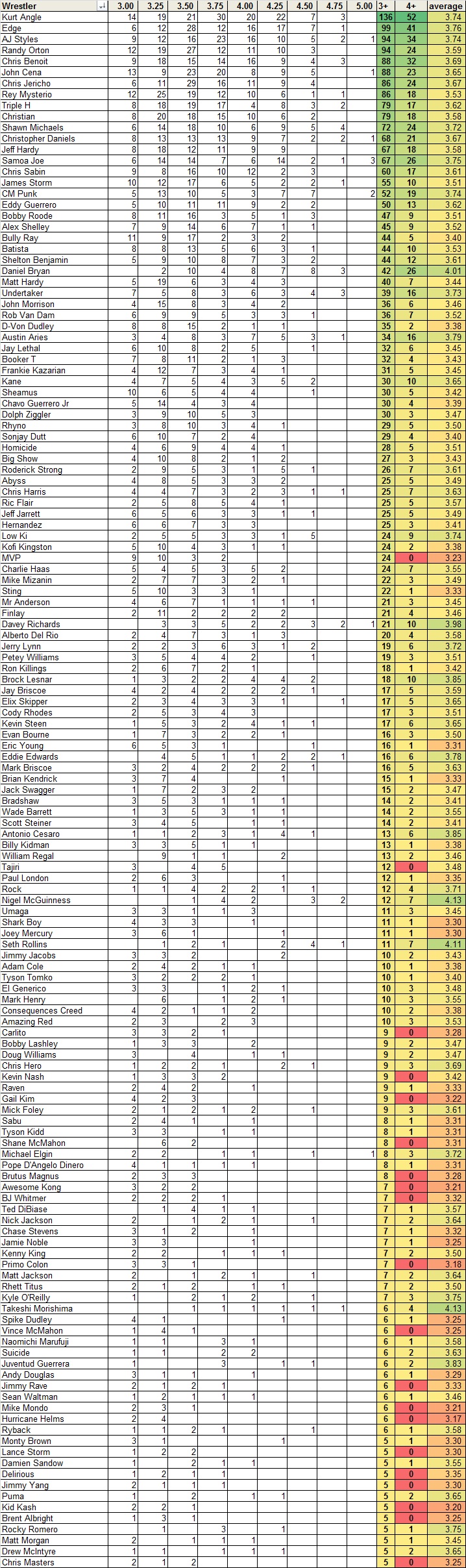 Number of 3+ Star matches (as rated by Dave Meltzer's Wrestling Observer) by Year (covers 1986-2013) - includes WWF/WWE, ECW, ROH and TNA federations Distribution of Stars Year-by-year Detailed List (click to enlarge) Data was compiled at starratingslist.blogspot.com Analysis by Chris Harrington (indeedwrestling.com) Last updated: August 2013 2002-2013 - just WWF, TNA and ROH (post WCW/ECW folding) Distribution of Stars (2002-August 2013) Just PPVs and TV Specials (1986-2013) |