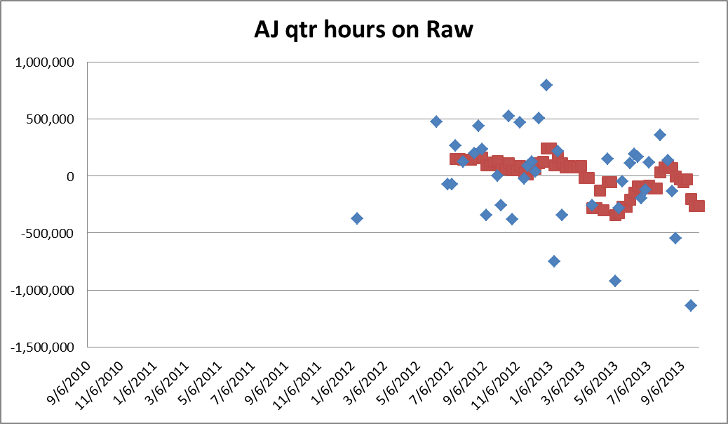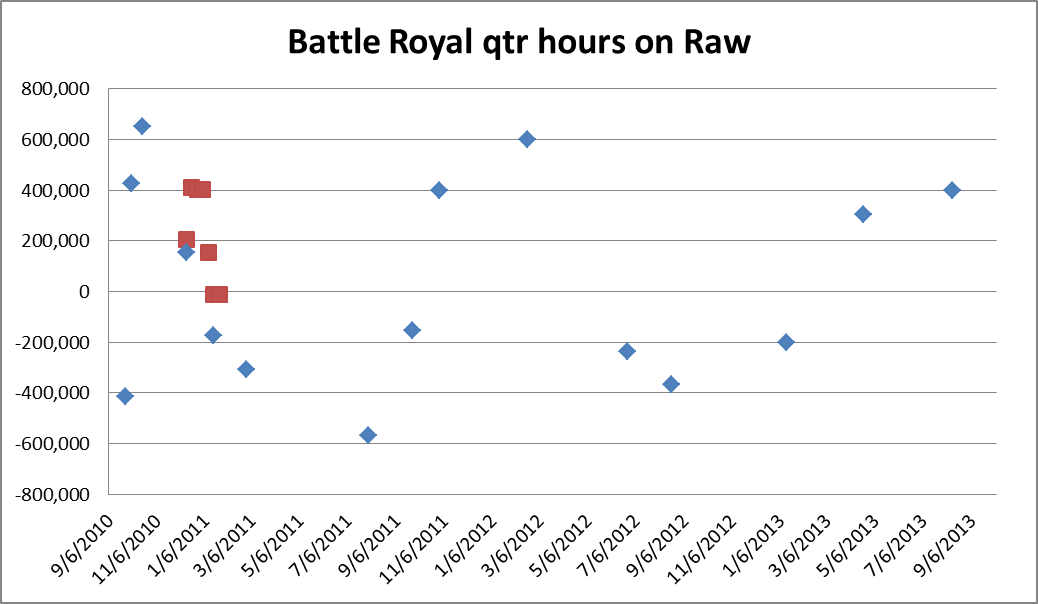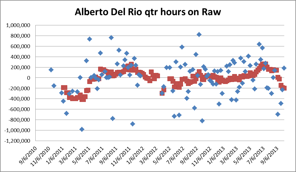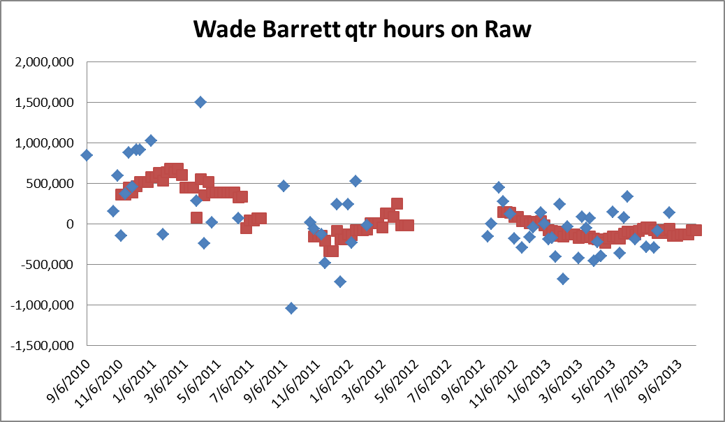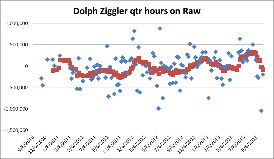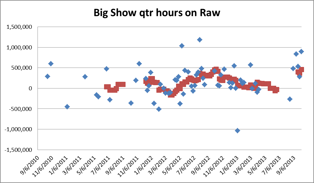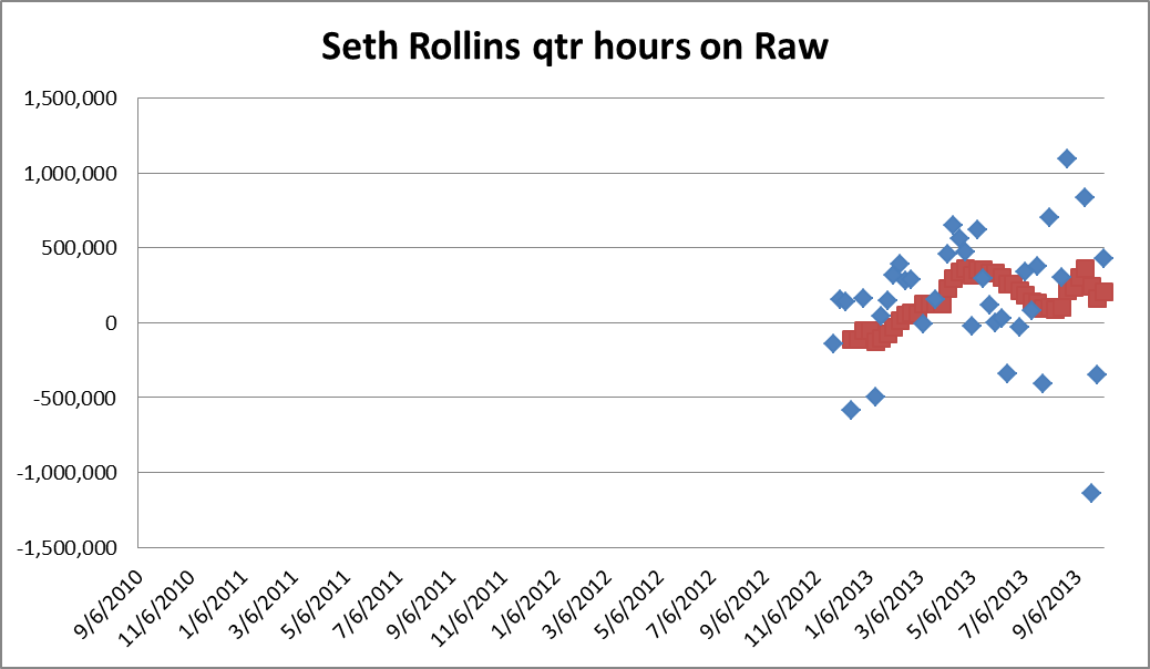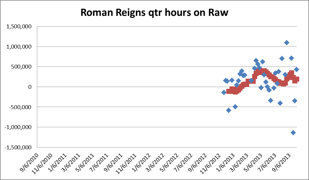 - This pretends everyone in each “segment” was equally responsible for driving the viewership change. If JTG is destroyed by Brock Lesnar and a half million people tune in, both JTG and Brock would get a +500,000 for that segment. Clearly, there’s room for improvement because a thoughtful analysis would consider what acts appear to be driving the quarter-hour rating and what acts just happen to have a little cameo during that time. My workaround was to try and focus on wrestlers that appeared on several shows (not just several segments, but many different episodes of Raw) as well as to look across large swaths of time for the average.