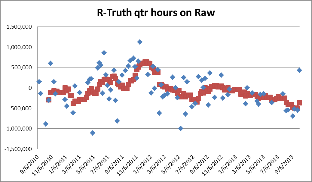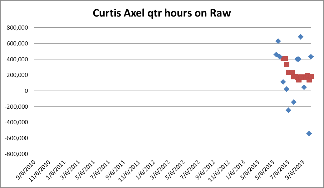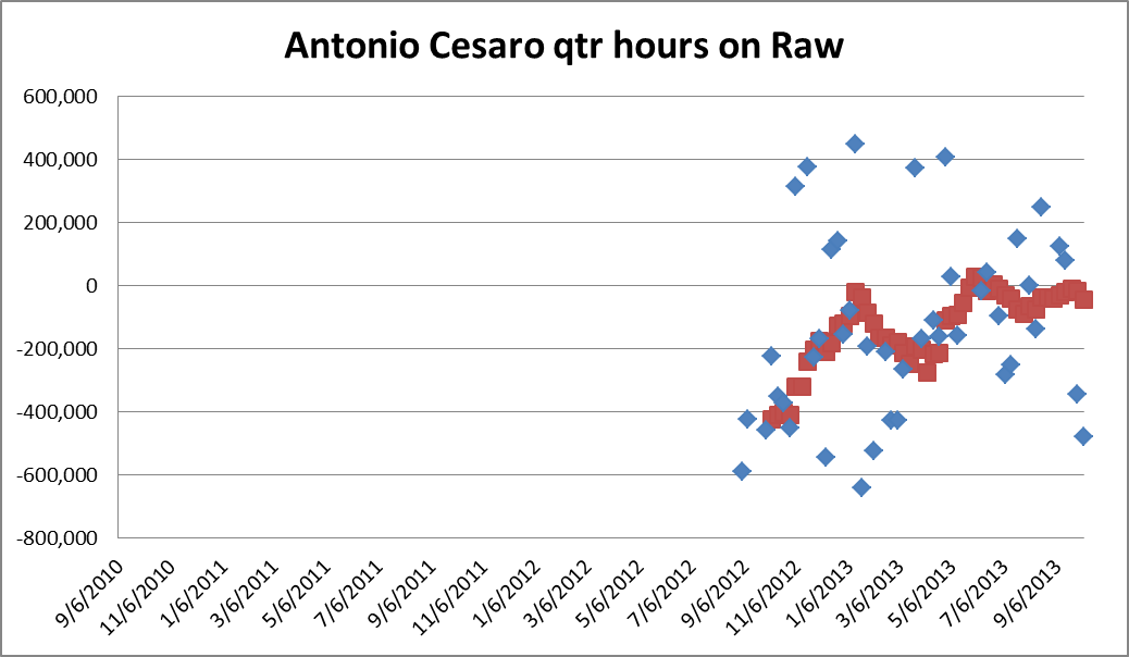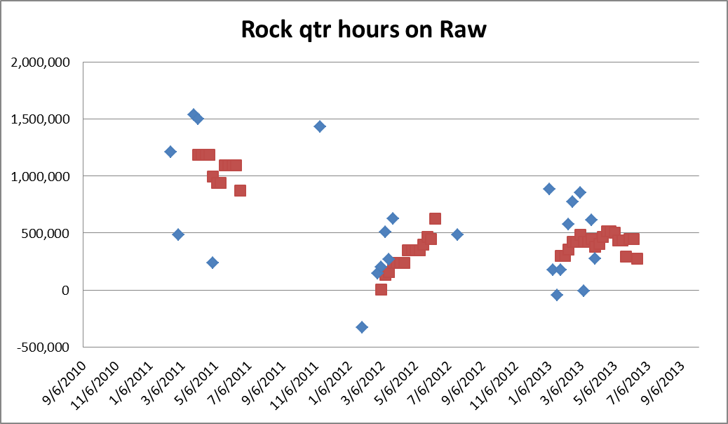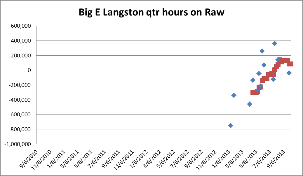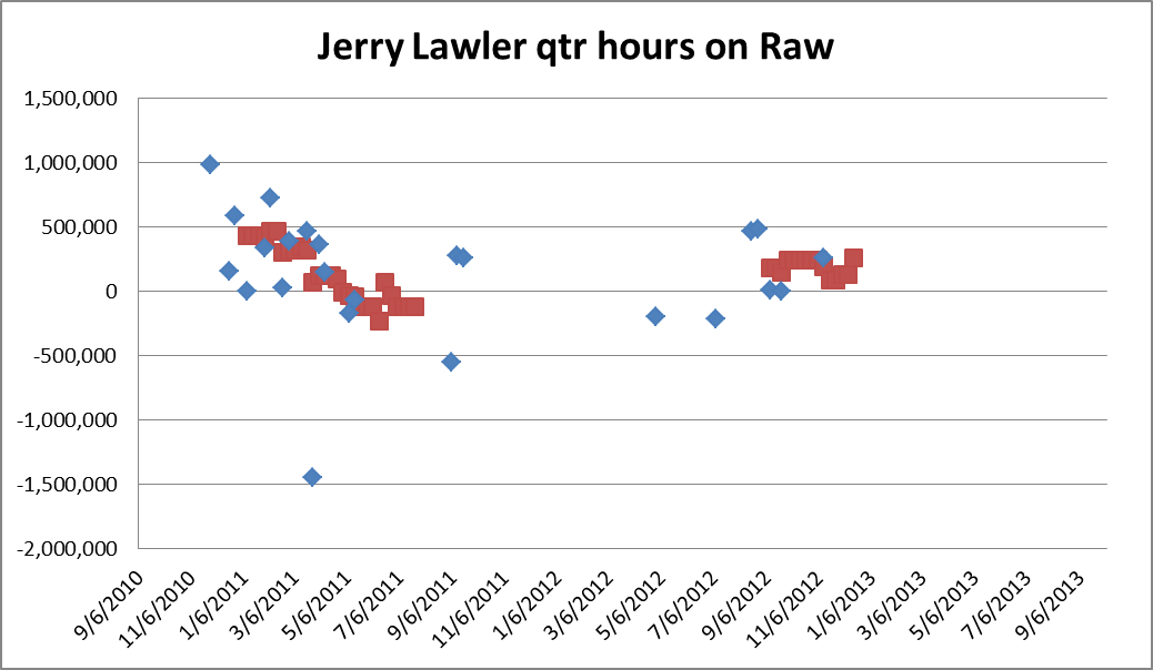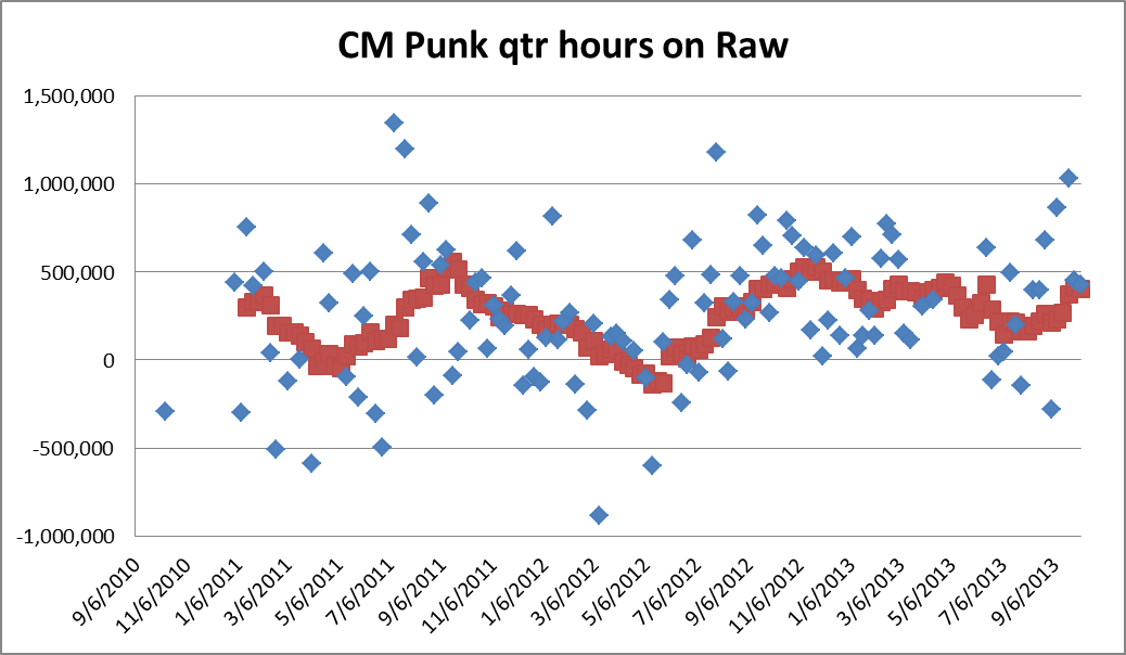 - This pretends everyone in each “segment” was equally responsible for driving the viewership change. If JTG is destroyed by Brock Lesnar and a half million people tune in, both JTG and Brock would get a +500,000 for that segment. Clearly, there’s room for improvement because a thoughtful analysis would consider what acts appear to be driving the quarter-hour rating and what acts just happen to have a little cameo during that time. My workaround was to try and focus on wrestlers that appeared on several shows (not just several segments, but many different episodes of Raw) as well as to look across large swaths of time for the average.