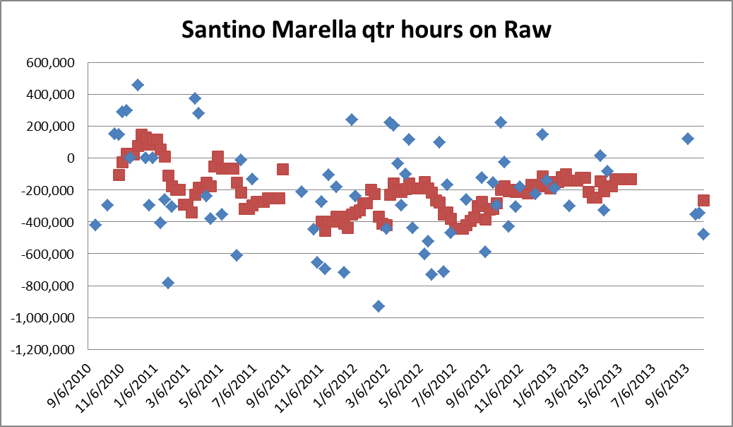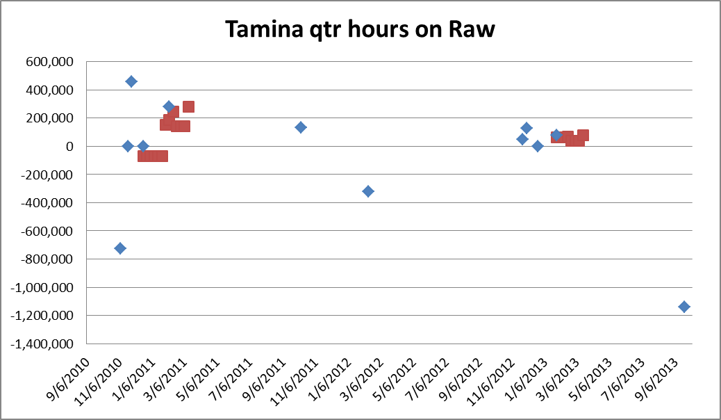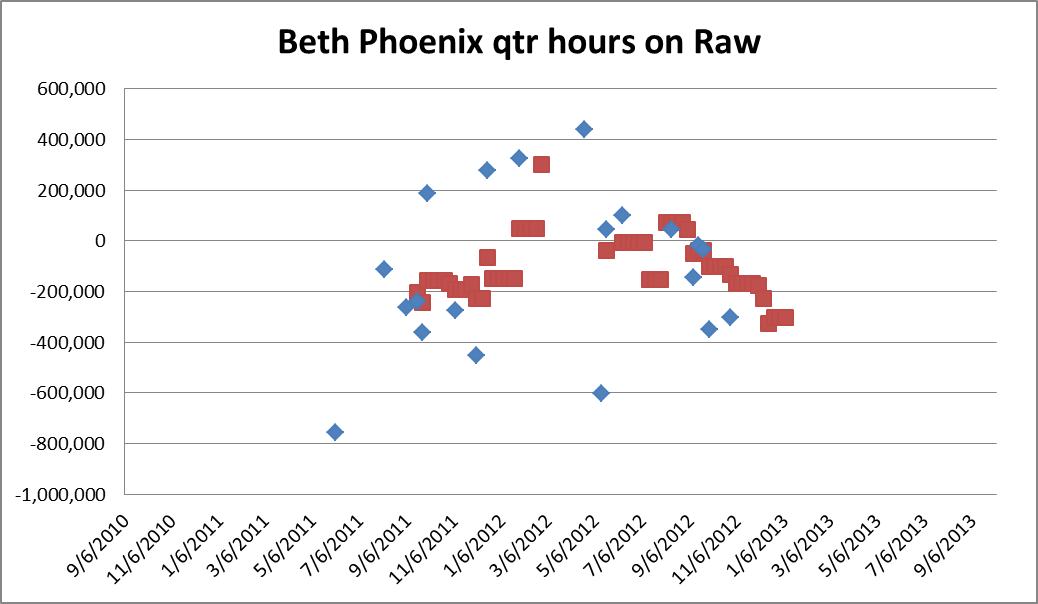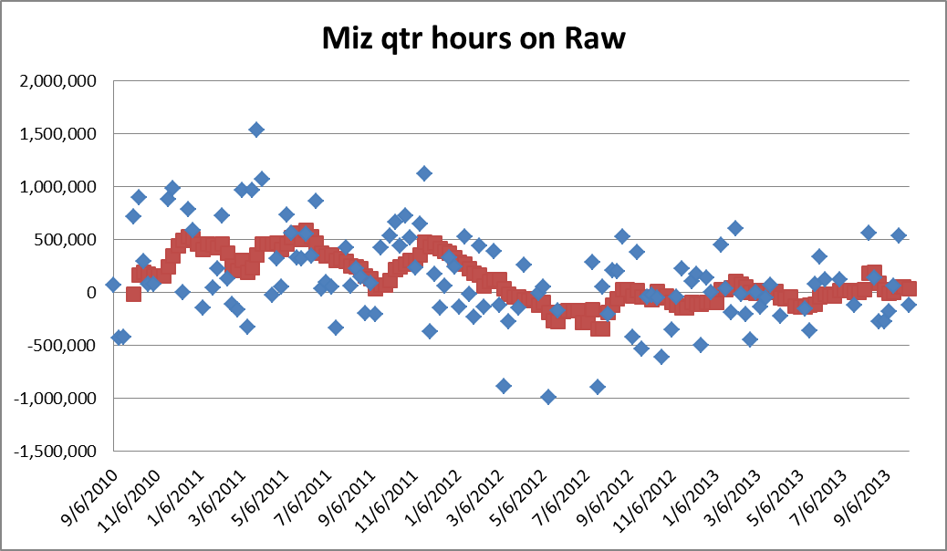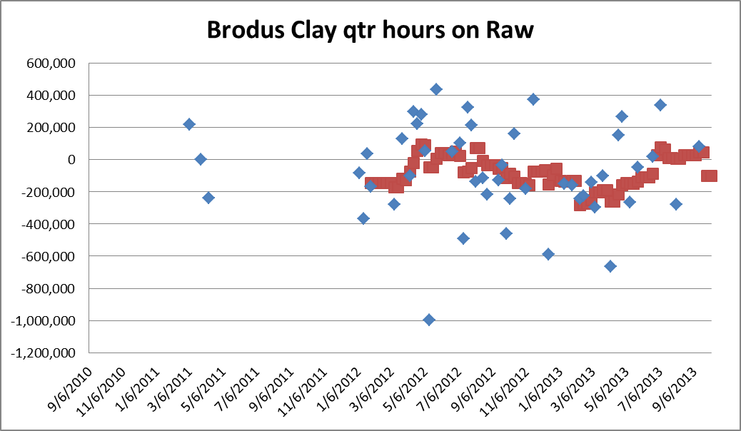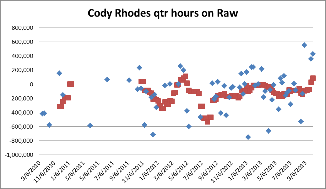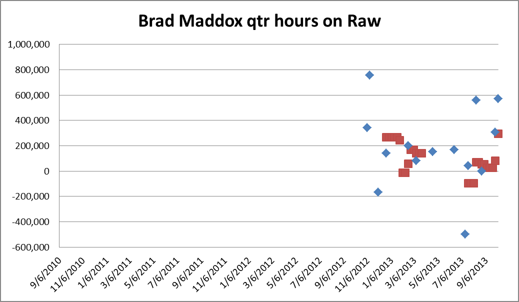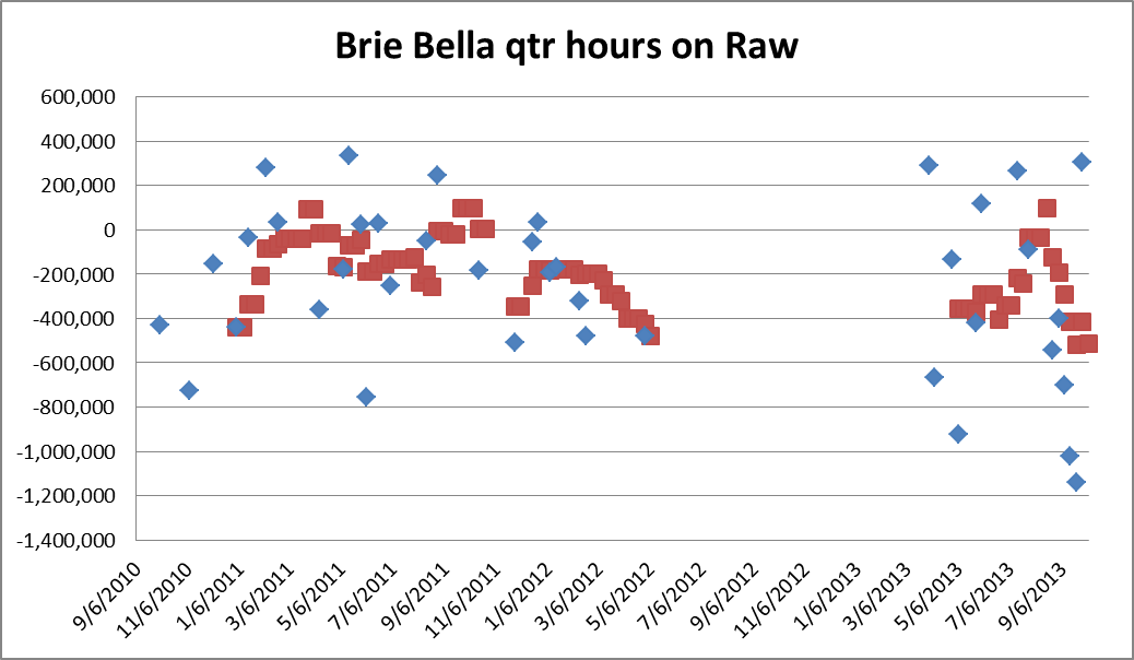 - This pretends everyone in each “segment” was equally responsible for driving the viewership change. If JTG is destroyed by Brock Lesnar and a half million people tune in, both JTG and Brock would get a +500,000 for that segment. Clearly, there’s room for improvement because a thoughtful analysis would consider what acts appear to be driving the quarter-hour rating and what acts just happen to have a little cameo during that time. My workaround was to try and focus on wrestlers that appeared on several shows (not just several segments, but many different episodes of Raw) as well as to look across large swaths of time for the average.
