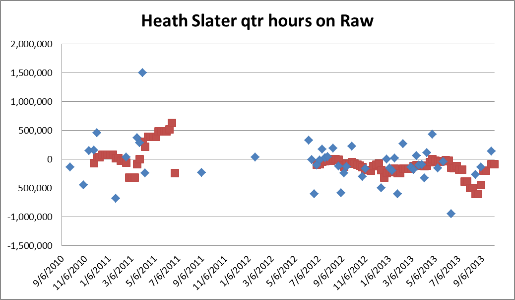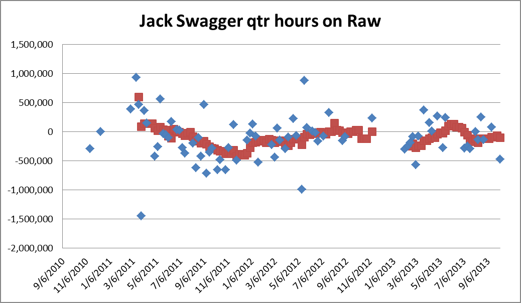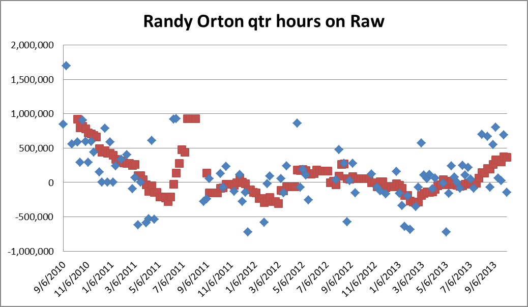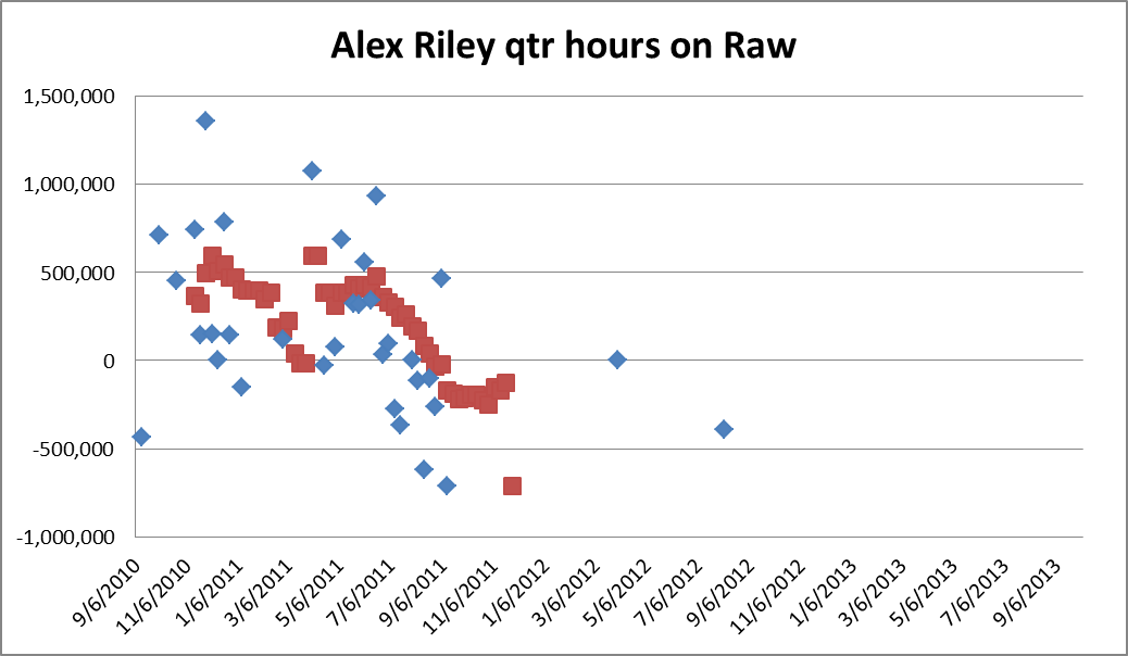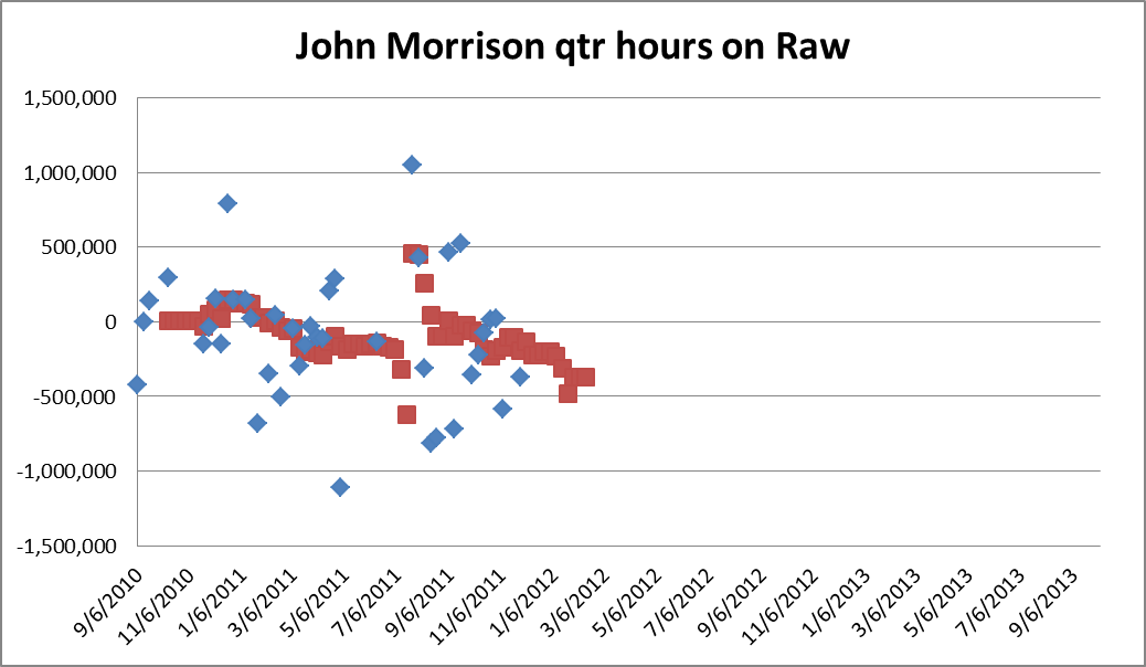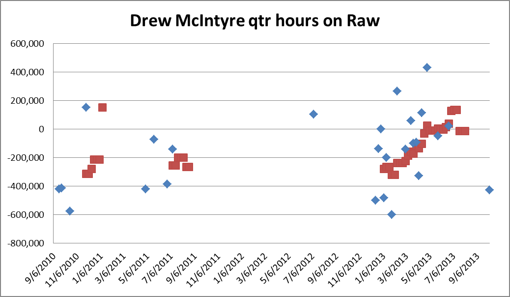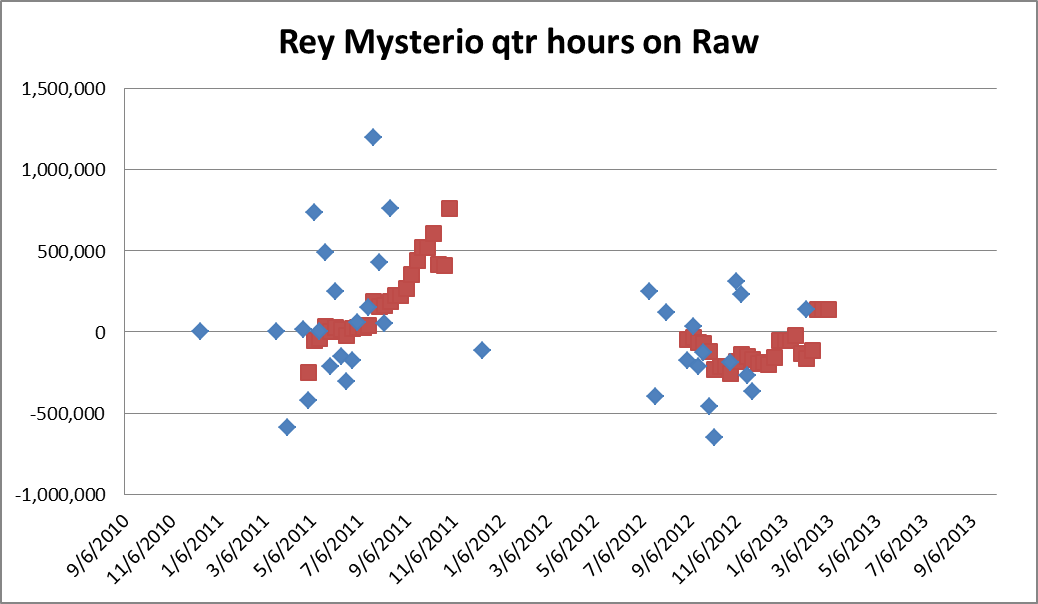 - This (mostly) ignores normal Raw ratings patterns. There are quarter-hours when Raw viewership normally picks up and there are quarter-hours where Raw viewership normally drops. After more than two decades, WWE has trained and re-trained their fans about when the important stuff normally happens. Interestingly, the dawn of the weekly 3-hour Raw has generated another set of viewership habits where Raw often loses viewers from the start of the show to the end of the show. WWE is hardly ignorant of the trends, and therefore it’s not surprising that they often program similar material and similar people (at least on a status basis) in the same slots week-over-week. In some ways this can become a self-fulfilling prophecy – treat someone like a goof in a blow-off timeslot and the audience will view them that way for a long time. That doesn’t “prove” they can’t draw- it just shows that the company doesn’t think enough of them to protect them. However, without a fully functioning model of who draws and repulses viewers, all we have is our scattered data points. The caveat to this was that I did throw in some safeguards around the “overrun” segment (the “big angle” before WWE goes off the air each week). The overrun segment can see a million people tune in — now, it says something about your placement in the company when you’re in the overrun segment, but on the other hand, it’s going to greatly boost your numbers the most often you’re slotted in there, and that doesn’t necessarily imply you’re the driving force behind why those viewership numbers explode. That’s why I find it necessary to look at people’s numbers with and without overrun included.