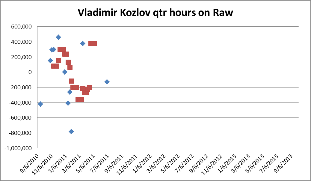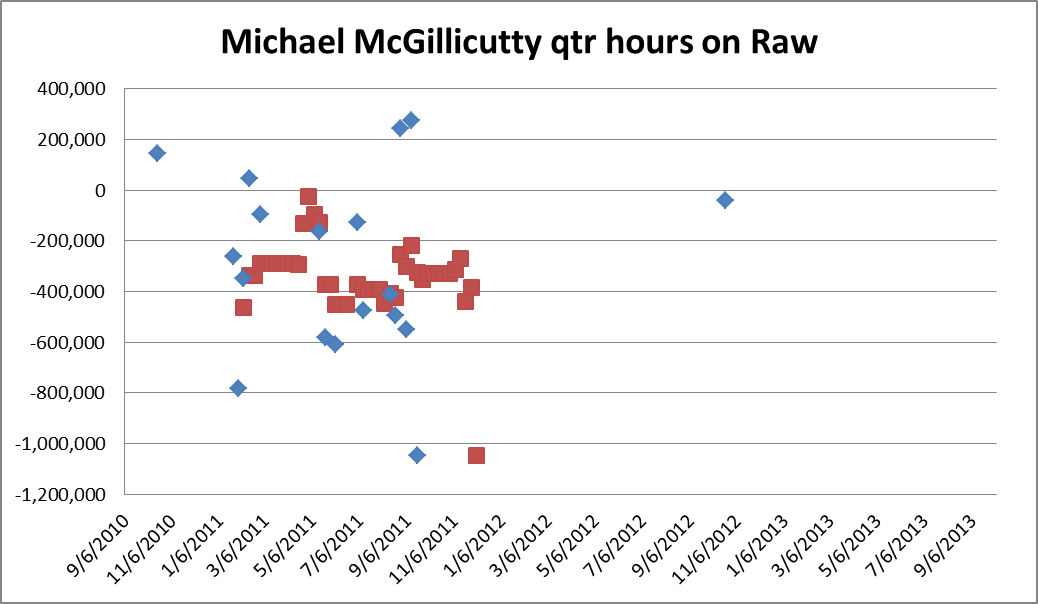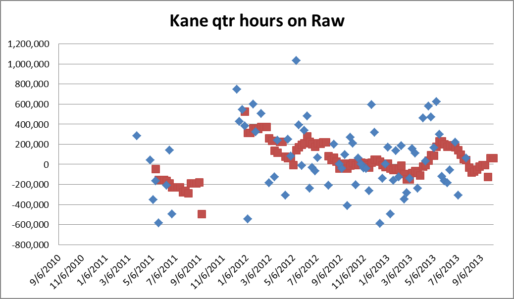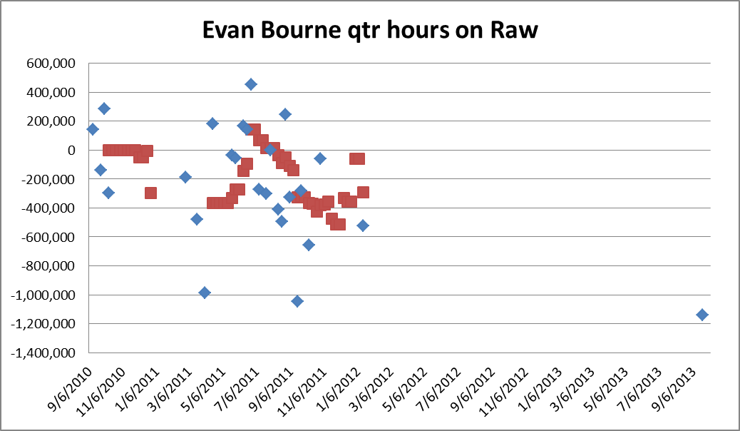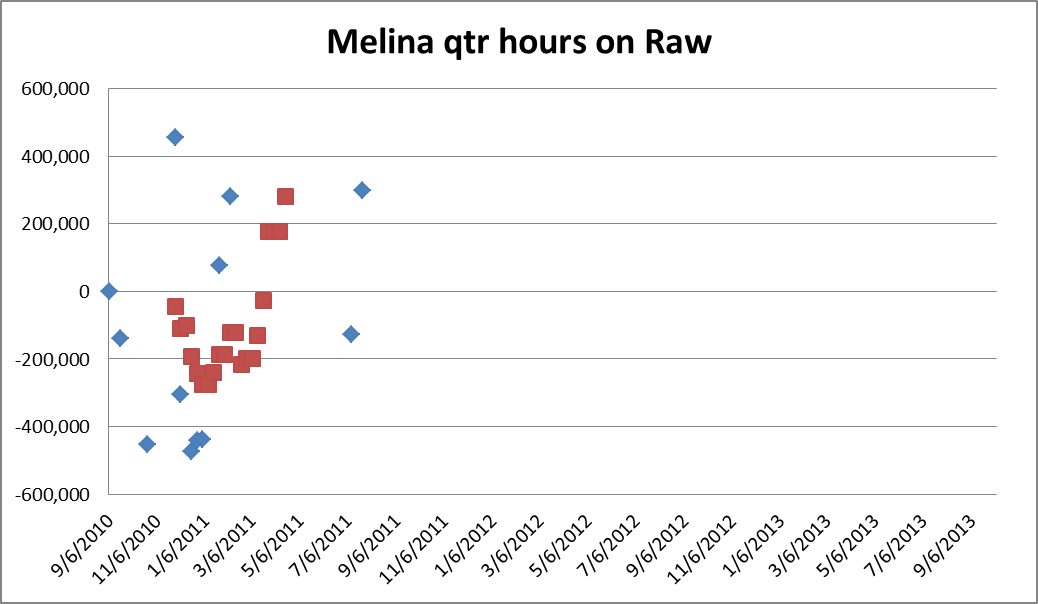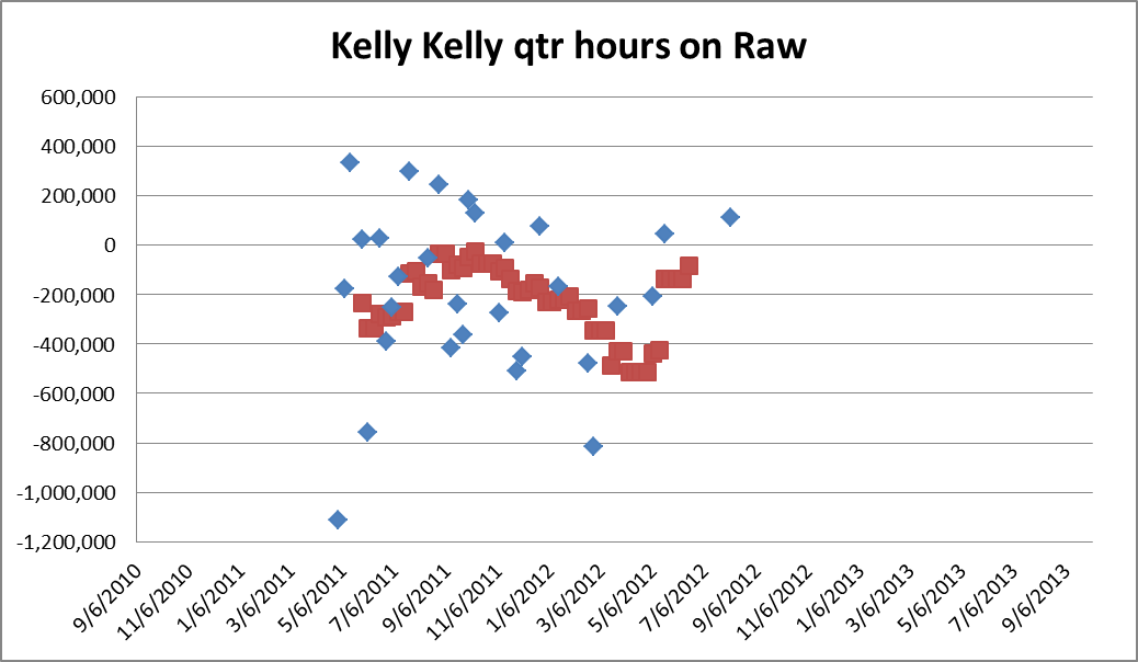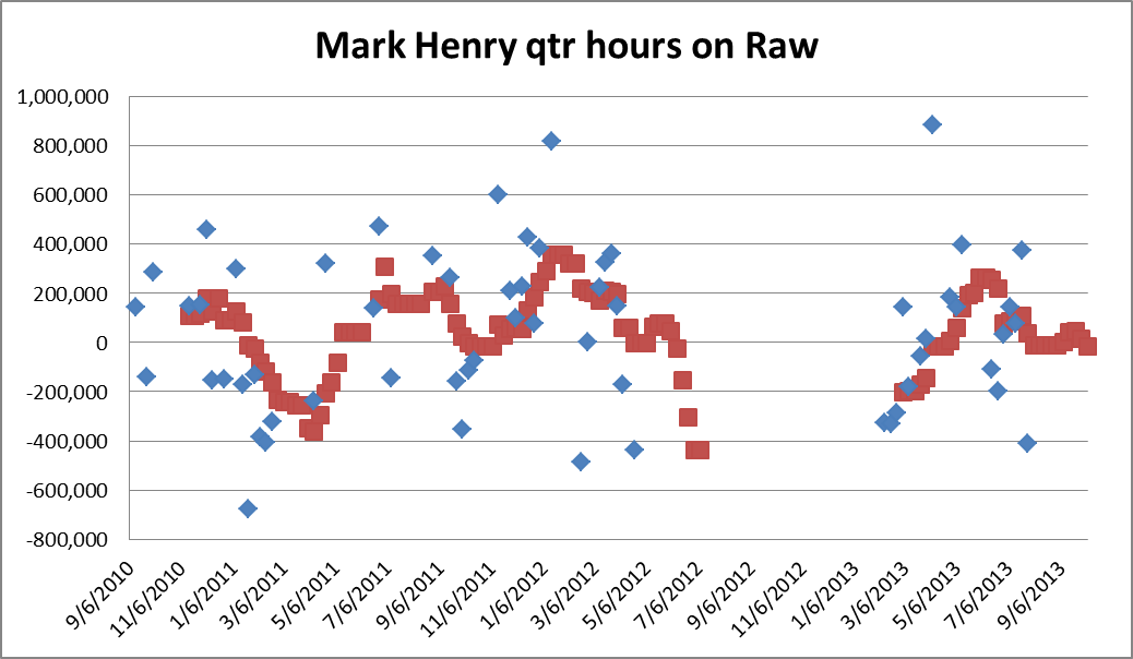 - This (mostly) ignores normal Raw ratings patterns. There are quarter-hours when Raw viewership normally picks up and there are quarter-hours where Raw viewership normally drops. After more than two decades, WWE has trained and re-trained their fans about when the important stuff normally happens. Interestingly, the dawn of the weekly 3-hour Raw has generated another set of viewership habits where Raw often loses viewers from the start of the show to the end of the show. WWE is hardly ignorant of the trends, and therefore it’s not surprising that they often program similar material and similar people (at least on a status basis) in the same slots week-over-week. In some ways this can become a self-fulfilling prophecy – treat someone like a goof in a blow-off timeslot and the audience will view them that way for a long time. That doesn’t “prove” they can’t draw- it just shows that the company doesn’t think enough of them to protect them. However, without a fully functioning model of who draws and repulses viewers, all we have is our scattered data points. The caveat to this was that I did throw in some safeguards around the “overrun” segment (the “big angle” before WWE goes off the air each week). The overrun segment can see a million people tune in — now, it says something about your placement in the company when you’re in the overrun segment, but on the other hand, it’s going to greatly boost your numbers the most often you’re slotted in there, and that doesn’t necessarily imply you’re the driving force behind why those viewership numbers explode. That’s why I find it necessary to look at people’s numbers with and without overrun included.