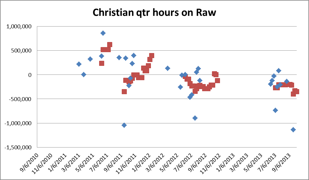 In this comparison, Bryan has gone from losing viewers (-101,792) in the first quarter, to gaining viewers (+186,331) in the second quarter to strong gains (+491,967) in the third quarter and beyond. Sounds compelling right? But consider Big Show from September to November he was averaging viewership gain of +647,167. However, there hasn’t been a groundswell of Paul Wight supporters trying to prove he was cheated out of a championship run. That’s because simply using skewed viewership numbers without context is just yelling into a vacuum. You can prove or disprove whatever you want based on whatever narrative you have. If you don’t control for who is in the overrun segment (which is key because it’s such a disproportionate viewership swell) you are just going to prove that whomever was in the big angle that week, is the big draw. It’s a self-fulfilling prophesy. (And if people are wondering why authority figures draw well – that’s because when they’re on television, usually important people like the champion is also on TV.) The reality is that WWE carefully crafts who they put in each segment. Consider how they doubled the length of the ADR/Kofi match this past week so it would fill a quarter hour originally set aside for a CM Punk interview. They didn’t want to throw off the rest of the schedule. Women’s wrestling doesn’t usually draw big numbers. Even the days of Sable driving viewership through the roof are gone. However, WWE routines books the women in the same slot and they routinely lose viewers. Hell, even great wrestling matches like the Shield versus Dolph Ziggler/Usos from 10/14/13 Raw lost over a million viewers because there was a Football competition. In 2011, Daniel Bryan wrestled Sheamus on the 3/14 Raw and lost 1.1 million viewers. There’s people like Rock & Brock who pop ratings and John Cena has been a proven ratings mover. Beyond that, people tune in the beginning of Raw after a major PPV to see what happened, and sometimes they tune in for big returns (like Big Dave Batista a few weeks ago).