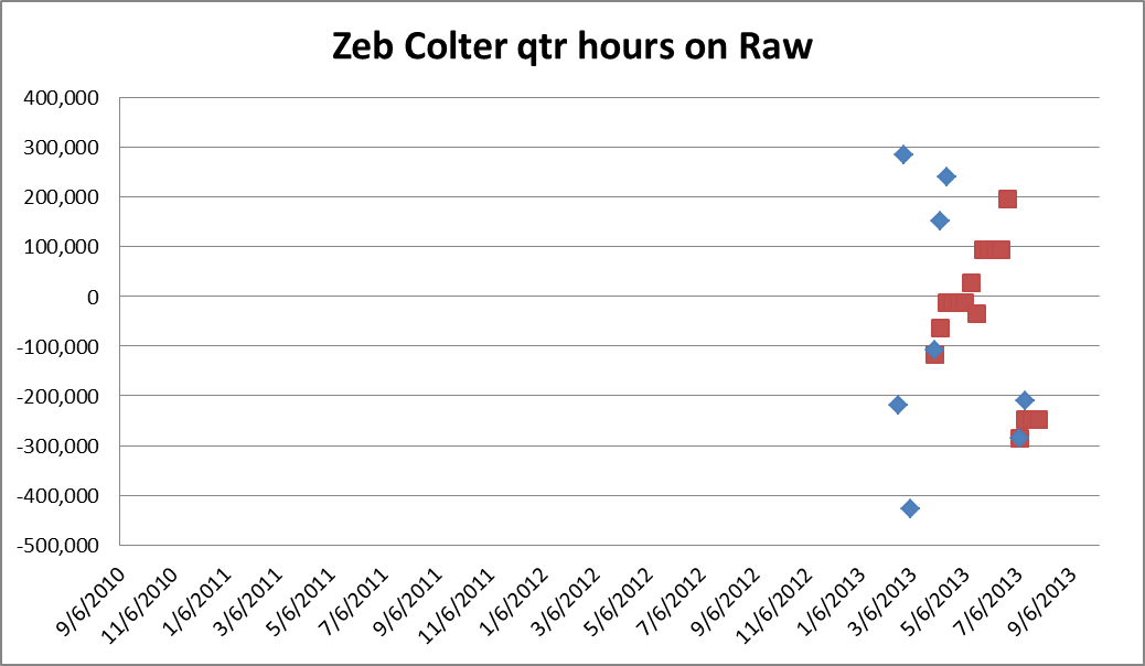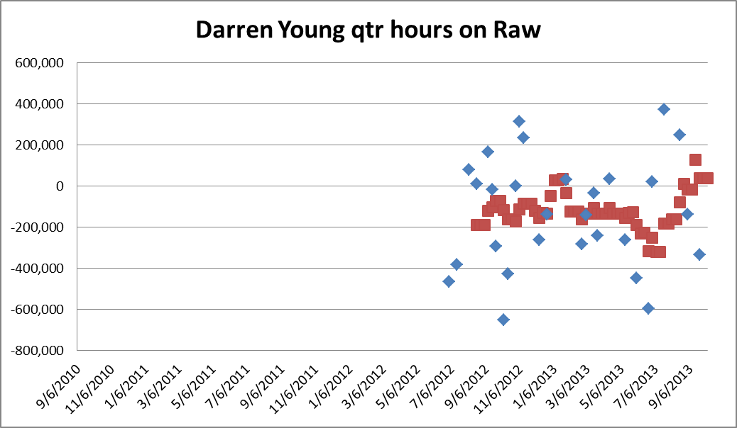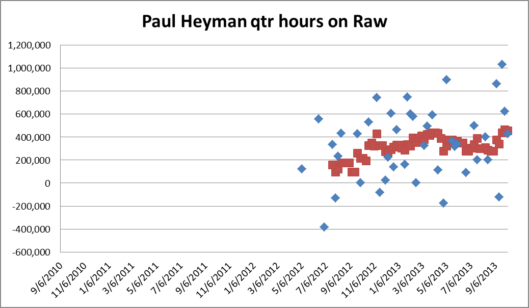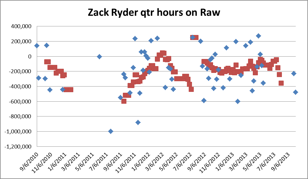 ArticleThere’s a been a lot of talk about whether WWE has a defense on why they haven’t strapped a rocket on Daniel Bryan in light of the outspoken crowd reactions at the Royal Rumble. I decided to resurrect a project that I had started months ago, namely – dissecting the raw ratings quarter hour viewership gains & losses by person. Methodology: - Take all of the detailed Raw quarter-hour reports from Dave Meltzer’s Wrestling Observer newsletter (subscription; available online at wrestlingobserver.com)