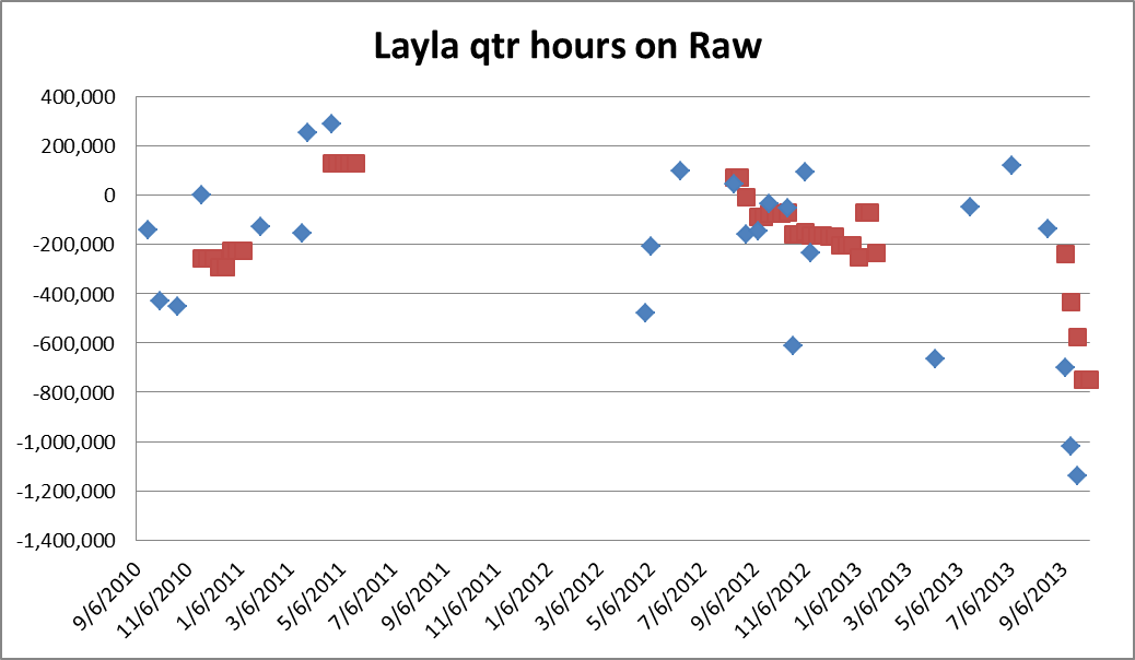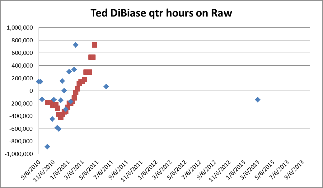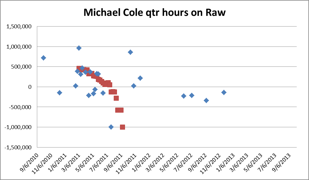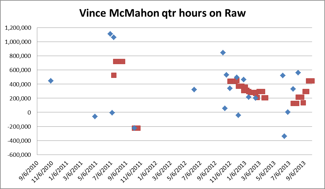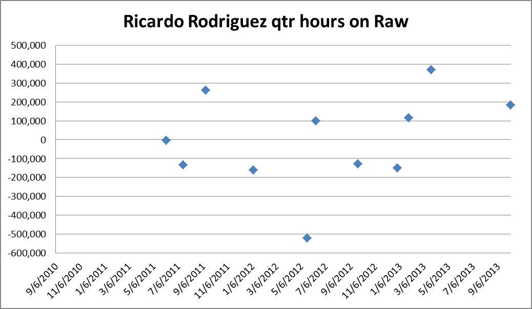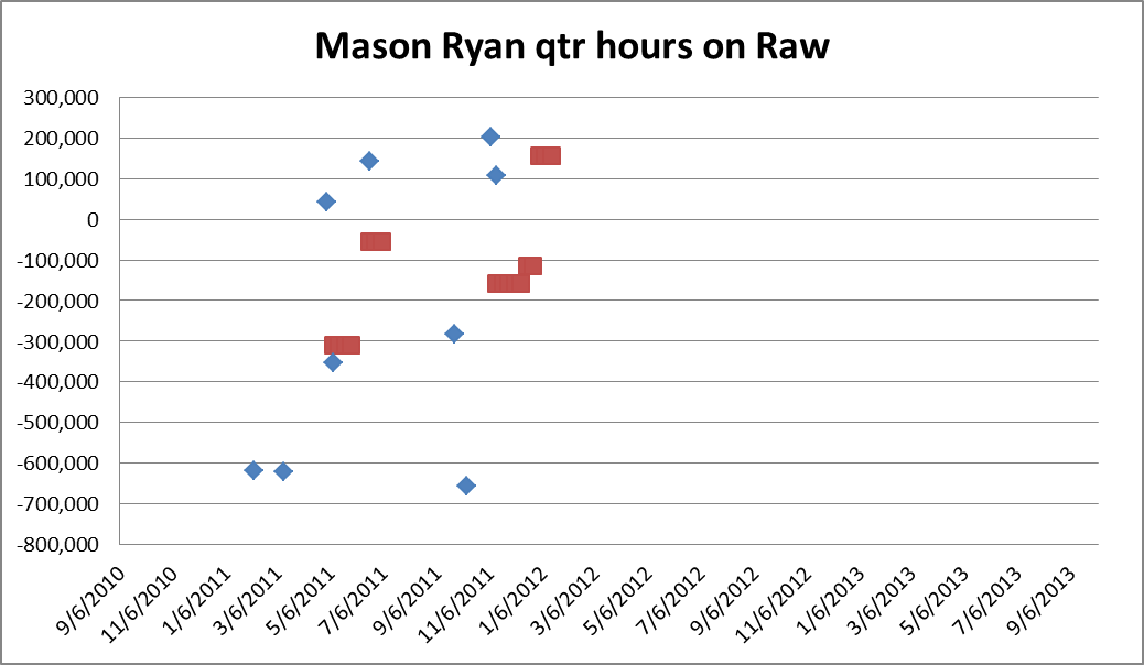 This data covers (though not every week has every quarter-hour, sometimes only over-run available): 2011: 52 weeks 2012: 53 weeks 2013: 42 weeks (weekly ratings only through 10/7) This is clearly an imperfect science. It covers weeks with strong competition on television to weeks with little competition on television. It covers time-periods where you may be pushing a wrestlers as a main-event title contenders during one month and pushing them a comedy tag team goofball during a different time period. Why people do and do not tune in is not purely driven simply by who is on the screen. However, the hope is that by looking at the information over long periods of time we would be able to draw some conclusions about the trends we’re seeing. Lastly, it gets spotty since early October — this isn’t some fiendish plot by me to thwart people from evaluating Cena/Orton/Punk/Bryan in the post-Battleground world. Instead, Dave just hasn’t been providing the weekly Raw segment data in the newsletter. That’s all. “The rule of thumb is not to overreact to one week’s rating” – Dave Meltzer I decided to run the data essentially four different ways: with and without the overrun segment (the final period where Raw spills over the 11 PM EST hour and viewers for next USA programming tune in as well as fans that have been programmed to check out what’s going on to close out Raw) and using show averages and using show maximums. Since I was trying to tallying all the people involved in a segment, oftentimes a wrestler can appear more than once (interview, match, video package, etc.). To give the benefit of the doubt, I ran the numbers using both the “average viewership change” by wrestler in that show as well as a “maximum viewership change” by wrestler in that show. You did have to appear in a minimum of 5 shows to be included in the calculation. This was to prevent any freak show circumstances from being overly influential and leave off guest hosts (though I think we can all agree that Wayne Brady is the key to a WWE renaissance). Gains & Losses2011 – 2013 Viewership Gains/Losses for RawBiggest Viewership Gainers 2011 1 Jim Ross 344,893 2 John Cena 331,171 3 HHH 246,231 4 The Miz 241,065 5 CM Punk 165,536 6 Michael Cole 164,008 7 John Laurinaitis 104,608 8 R-Truth 101,238 9 Christian 95,217 10 Alex Riley 93,311 11 The Big Show 86,191 12 Jerry Lawler 83,522 13 Rey Mysterio 23,013 Biggest Viewership Losers 2011 1 Mike McGillicutty (336,938) 2 Zack Ryder (323,981) 3 Santino Marella (308,125) 4 David Otunga (245,324) 5 Kofi Kingston (233,407) 6 Evan Bourne (227,944) 7 Beth Phoenix (222,444) 8 Mason Ryan (218,875) 9 John Morrison (209,629) 10 Nikki Bella (196,341) 11 Kelly Kelly (194,762) 12 Cody Rhodes (191,909) 13 Natalya (184,154) 14 Jack Swagger (169,717) 15 Sheamus (150,990) 16 Dolph Ziggler (136,509) 17 Eve Torres (108,318) 18 Brie Bella (97,567) 19 Vickie Guerrero (76,179) 20 Daniel Bryan (69,000) Biggest Viewership Gainers 2012 1 Undertaker 572,657 2 HHH 380,624 3 Vince McMahon 342,781 4 The Rock 310,149 5 Shawn Michaels 303,315 6 Brock Lesnar 290,827 7 Vickie Guerrero 223,403 8 John Cena 218,700 9 Paul Heyman 192,610 10 CM Punk 179,546 11 John Laurinaitis 179,165 12 The Big Show 153,624 13 Chris Jericho 124,365 14 AJ Lee 121,523 15 Kane 68,418 16 The Great Khali 58,000 17 Mark Henry 56,738 18 Wade Barrett 50,308 19 Randy Orton 36,935 20 Ryback 30,146 Biggest Viewership Losers 2012 1 Kelly Kelly (251,571) 2 Jinder Mahal (245,750) 3 Santino (216,836) 4 Cesaro (202,467) 5 Primo (191,933) 6 Kofi Kingston (189,067) 7 Epico (187,592) 8 Christian (186,100) 9 Zack Ryder (156,023) 10 Layla (153,273) 11 Kaitlyn (150,700) 12 Titus O’Neil (138,000) 13 Damien Sandow (134,454) 14 Darren Young (131,929) 15 Rey Mysterio (131,580) 16 Cody Rhodes (121,731) 17 Tyson Kidd (121,571) 18 Justin Gabriel (121,167) 19 Jack Swagger (105,278) 20 The Miz (95,891) Biggest Viewership Gainers Jan-Oct 2013 1 The Rock 335,698 2 Brock Lesnar 330,068 3 John Cena 328,401 4 Paul Heyman 317,531 5 HHH 259,420 6 CM Punk 246,534 7 Stephanie McMahon 242,841 8 Vickie Guerrero 234,359 9 Vince McMahon 203,475 10 Brad Maddox 168,819 11 Seth Rollins 167,388 12 Roman Reigns 166,292 13 The Big Show 161,143 14 Daniel Bryan 155,341 15 Dean Ambrose 135,652 16 Ryback 91,294 17 Curtis Axel 59,699 18 Kane 48,198 19 Sheamus 40,064 20 Randy Orton 36,306 Biggest Viewership Losers Jan-Oct 2013 1 Cameron (496,714) 2 Layla (486,500) 3 Aksana (397,000) 4 Naomi (389,417) 5 R-Truth (322,143) 6 Brie Bella (322,133) 7 Nikki Bella (311,375) 8 Natalya (299,300) 9 Alicia Fox (234,875) 10 Christian (208,000) 11 The Uso’s (205,417) 12 Kofi Kingston (202,158) 13 Great Khali (201,200) 14 Damien Sandow (184,140) 15 Fandango (179,640) 16 Santino Marella (179,438) 17 Bray Wyatt (171,225) 18 Zack Ryder (153,643) 19 AJ Lee (152,838) 20 Erick Rowan (142,250) The viewership number calculated here is an amalgamation of the four numbers I previously mentioned. It’s the average of w/ & w/o overrun #s split between where you’re using the average method (75% weighting) and the maximum method (25% weighting). CommentaryAgain, this is quite imperfect but I must say the results do seem to align to general WWE-think. That is to say, when you look at who they push on television and which segments they put those people, there is an intent to promote certain people. While I find the results quite interesting, I do want to emphasize several points: - This looks at quarter-hour viewership changes. That’s how many people tuned in or tuned during the fifteen minutes measured. There’s a host of reasons that viewers tune-in and tune-out through a show. Some of it has to do with specific time periods (top of the hour, the end of show overrun). Some of it has to do with television competition – specifically major sports events like Football games. Some of it has to do with who is on the screen. Some of it has to do with who was on the screen (i.e. big-drop offs