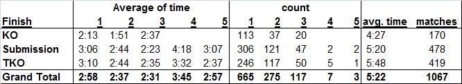 Statistics calculated by Mookie Harrington  Fights/Year 1994 to 2004 averaged 40 UFC fights/year. 2005 was a big year where they doubled to 80 fights. 2006 doubled that again to 158 fights. 2007 had 171 fights. 2008 had 201 fights. 2009 had 215 fights. 2006 to 2009 annual average 46 lightweight fights 47 welterweight fights 38 middleweight fights 33 light heavyweight fights 23 heavyweight fights There is an average of 2 championship bouts per weight class each year. Average fight lengths are remarkable similar in all of the weight categories (2006 to 2009 average = 745 fights) * Lightweight: 9 min 25 sec (drops to 8:59 without championship bouts) * Welterweight: 9 min 38 sec (drops to 9:27 without championship bouts) * Middleweight: 8 min 36 sec (drops to 8:27 without championship bouts) * Light Heavyweight: 8 min 49 sec (drops to 8:24 without championship bouts) * Heavyweight: 8 min 24 sec (drops to 7:47 without championship bouts) Average: 9 minutes 4 sec (drops to 8:46 without championship bouts) 2009 non-championship bout average (at 9:36) continues the matchlength trend growth than 2008 (8:24), 2007 (8:54), 2006 (8:12), 2005 (8:00), 2004 (7:36). Interesting, a similar trend for non-championship bouts existed from 1999 to 2003 where the times moved from 7:36 / 8:24 / 8:06 / 8:12 / 8:54. Matches that did not end in decision were over in less than 6 minutes on average. Number of matches that did end in decision did increase in 2009 versus previous five years (up to 43%) which is an increase from 2008 (32%), 2007 (36%), 2006 (33%) and 2005 (24%).  Consider 2009: By my count, there was 249 people who competed in a UFC ring in 2009 (up from 219 in 2008 and 193 in 2007). For 46 of them, they debuted in UFC this year and only fought once. Excluding them, that leaves 203 people who fought in UFC at least twice, and thus we can calculate the time between their most recent UFC fight and their previous UFC fight. Less than 30 days: 1 (Anthony Johnson) 30-60 days: 4 (Xavier Foupa-Pokam, Stefan Struve, Luigi Fioravanti, Steve Bruno) 60-90 days: 16 90-120 days: 24 120-150 days: 27 150-180 days: 58 180-210 days: 20 210-240 days: 16 240-270 days: 5 270-300 days: 6 300-330 days: 10 330-365 days: 2 (Matt Hughes, Ryan Jensen) 1 year to 1.5 years: 6 (Nate Mohr, Matt Serra, Roger Huerta, Troy Mandaloniz, Houston Alexander, Tito Ortiz) 1.5 years to 2 years: 1 (Carmelo Marrero) 2 years to 3 years: 1 (David Loiseau) 3 years to 4 years: 1 (Paul Buentello) 4 years to 5 years: 4 (Frank Trigg, Dennis Hallman, Vitor Belfort, Phil Baroni) 5 years to 6 years: 1 (Vladimir Matyushenko who returned at UFC 103 to win in Sept 2009 and last fought at UFC 44 in Sept 2003) From this list, more than 50% of the fighters competed within 6 months after their last UFC match. When you exclude the bottom 10 guys with the longest break between UFC matches, the average break was 170 days. That's a big contrast to pro-wrestlers. For 2008, I counted 158 wrestlers who were on TV at an average of about 17 TV matches each year. (The number is much higher at 25 matches/year for wrestlers with four or more TV matches.) So, the average break was probably less than two weeks. UFC guys fought an average of 1.8 times in 2009. 46 who debuted in 2009 and have only fought once in UFC: Alexander Gustafsson, Alexandre Barros, Ben Rothwell, Brendan Schaub, Brian Cobb, Cameron Dollar, Chase Gormley, Chris Tuchscherer, Danillo Villefort, Darrill Schoonover, Derek Downey, Fabricio Camoes, Frank Lester, Igor Pokrajac, Ivan Serati, Jacob Volkmann, Jake Ellenberger, James McSweeney, Jared Hamman, Jay Silva, Jesse Lennox, Jesse Sanders, Joe Brammer, Jon Madsen, Justin Wren, Kevin "Kimbo" Ferguson, Lucio Linhares, Marcus Jones, Matt Mitrione, Mike Russow, Neil Grove, Nik Lentz, Nissen Osterneck, Paul Daley, Peter Sobotta, Rafaello Oliveira, Ricardo Funch, Rodney Wallace, Roy Nelson, Ryan Madigan, Steve Lopez, Steve Steinbeiss, Tim McKenzie, Todd Duffee, Tom Egan, Yoshihiro Akiyama 21 who debuted in 2009 and fought twice in UFC: Xavier Foupa-Pokam, Tim Hague, Ross Pearson, Rick Story, Nick Osipczak, Mike Pyle, Mike Pierce, Mike Ciesnolevicz, Matt Veach, Mark Muñoz, Johny Hendricks, James Wilks, Evan Dunham, Edgar Garcia, Denis Stojnic, Dan Cramer, DaMarques Johnson, Carlos Condit, Brian Foster, Andre Winner, Aaron Simpson 8 who debuted in 2009 and fought thrice in UFC: Brian Stann, Denis Kang, Jake Rosholt, John Hathaway, John Howard, Nick Catone, Paulo Thiago, T.J. Grant 1 who debuted in 2009 and fought FOUR TIMES in UFC: Stefan Struve (3-1) There has only been five feuds which have had three matches in UFC: Randy Couture/Vitor Belfort (UFC 15/46/49) - Randy leads 2-1 (all TKOs) Ken Shamrock/Tito Ortiz - (UFC 40/61/Final Chapter) - Tito leads 3-0 (all TKOs) Georges St. Pierre/Matt Hughes - (UFC 50/65/79) - GSP leads 2-1 (Submission/TKO/Submission) Chuck Liddell/Randy Couture - (UFC 43/52/57) - Chuck leads 2-1 (all KO/TKOs) Andrei Arlovski/Tim Sylvia - (UFC 51/59/61) - Tim leads 2-1 (Submission/TKO/Decision) Additionally, only 35 pairs have fought twice in UFC: Aaron Riley vs. Shane Nelson (UFC 96 & 101) - Tied 1-1 Anderson Silva vs. Rich Franklin (UFC 64 & 77) - Anderson Silva leads 2-0 Anthony Johnson vs. Kevin Burns (UFC: FIGHT NIGHT 14 & ULTIMATE FIGHTER 8 FINALE) - Tied 1-1 B.J. Penn vs. Caol Uno (UFC 34 & 41) - BJ Penn won the first match, draw in second. B.J. Penn vs. Georges St. Pierre (UFC 94 & 58) - Georges St. Pierre leads 2-0 B.J. Penn vs. Jens Pulver (UFC 35 & ULTIMATE FIGHTER 5 FINALE) - Tied 1-1 B.J. Penn vs. Matt Hughes (UFC 63 & 46) - Tied 1-1 Brock Lesnar vs. Frank Mir (UFC 81 & 100) - Tied 1-1 Carlos Newton vs. Matt Hughes (UFC 34 & 38) - Matt Hughes leads 2-0 Chuck Liddell vs. Jeremy Horn (UFC 19 & 54) - Tied 1-1 Chuck Liddell vs. Renato Sobral (UFC 40 & 62) - Chuck Liddell leads 2-0 Chuck Liddell vs. Tito Ortiz (UFC 47 & 66) - Chuck Liddell leads 2-0 Dan Severn vs. Ken Shamrock (UFC 9 & 6) - Tied 1-1 Dan Severn vs. Oleg Taktarov (UF
