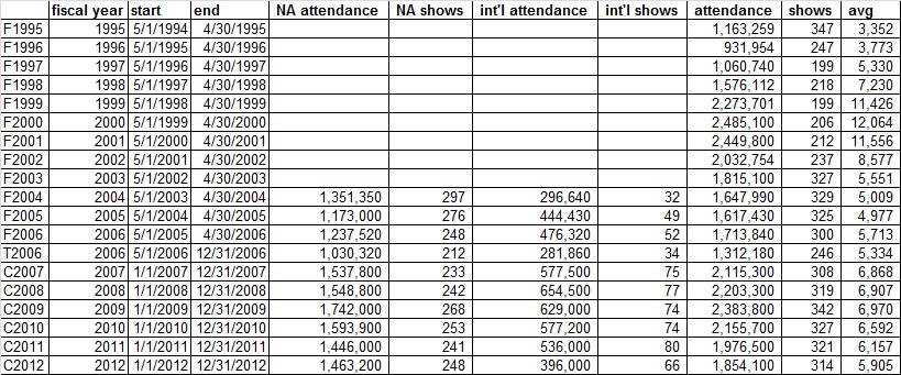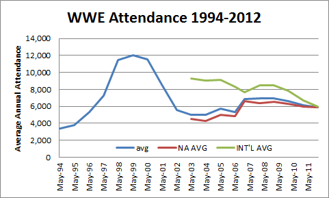 I've seen some confusion on this - sometimes people are mixed up about fiscal year & calendar year. Sometimes we're looking at the house shows (i.e. non-PPV and non-TV taping) numbers and sometimes we're looking at just north american numbers, and sometimes people are looking at the total attendance numbers and later there is even breakouts where they try to leave things like ECW only events out of the mix. Here are the numbers that WWE has reported in their SEC filings: ATTENDANCE CHARTDATAFiscal YearsF1995: starts May 1, 1994 to April 30, 1995: 1,163,259 attendance in 347 shows = 3,352 (A)F1996: starts May 1, 1995 to April 30, 1996: 931,954 attendance in 247 shows = 3,773 (A) F1997: starts May 1, 1996 to April 30, 1997: 1,060,740 attendance in 199 shows = 5,330 (A) F1998: starts May 1, 1997 to April 30, 1998: 1,576,112 attendance in 218 shows = 7,230 (A) F1999: starts May 1, 1998 to April 30, 1999: 2,273,701 attendance in 199 shows = 11,426 (A) F2000: starts May 1, 1999 to April 30, 2000: 2,485,100 attendance in 206 shows = 12,064 (B) F2001: starts May 1, 2000 to April 30, 2001: 2,449,800 attendance in 212 shows = 11,556 (B) F2002: starts May 1, 2001 to April 30, 2002: 2,032,754 attendance in 237 shows = 8,577 (B) F2003: starts May 1, 2002 to April 30, 2003: 1,815,100 attendance in 327 shows = 5,551 (C) F2004: starts May 1, 2003 to April 30, 2004: 1,647,990 attendance in 329 shows = 5,009 (C) = 1,351,350 NA attendance in 297 NA shows = 4,550 avg NA attendance; 296,640 int'l attendance in 32 int'l shows = 9,270 avg int'l attendance F2005: starts May 1, 2004 to April 30, 2005: 1,617,430 attendance in 325 shows = 4,977 (D) = 1,173,000 NA attendance in 276 NA shows = 4,250 avg NA attendance; 444,430 int'l attendance in 49 int'l shows = 9,070 avg int'l attendance F2006: starts May 1, 2005 to April 30, 2006: 1,713,840 attendance in 300 shows = 5,713 (D) = 1,237,520 NA attendance in 248 NA shows = 4,990 avg NA attendance; 476,320 int'l attendance in 52 int'l shows = 9,160 avg int'l attendance Transition YearT2006: starts May 1, 2006 to Dec 31, 2006: 1,312,180 attendance in 246 shows = 5,334 (D) = 1,030,320 NA attendance in 212 NA shows = 4,860 avg NA attendance; 281,860 int'l attendance in 34 int'l shows = 8,290 avg int'l attendance(This period also includes the 27 ECW touring events that were held separately before they pulled the plug on that touring project.) Calendar YearC2007: starts Jan 1, 2007 to Dec 31, 2007: 2,115,300 attendance in 308 shows = 6,868 (E) = 1,537,800 NA attendance in 233 NA shows = 6,600 avg NA attendance; 577,500 int'l attendance in 75 int'l shows = 7,700 avg int'l attendanceC2008: starts Jan 1, 2008 to Dec 31, 2008: 2,203,300 attendance in 319 shows = 6,907 (E) = 1,548,800 NA attendance in 242 NA shows = 6,400 avg NA attendance; 654,500 int'l attendance in 77 int'l shows = 8,500 avg int'l attendance C2009: starts Jan 1, 2009 to Dec 31, 2009: 2,383,800 attendance in 342 shows = 6,970 (F) = 1,742,000 NA attendance in 268 NA shows = 6,500 avg NA attendance; 629,000 int'l attendance in 74 int'l shows = 8,500 avg int'l attendance C2010: starts Jan 1, 2010 to Dec 31, 2010: 2,155,700 attendance in 327 shows = 6,592 (F) = 1,593,900 NA attendance in 253 NA shows = 6,300 avg NA attendance; 577,200 int'l attendance in 74 int'l shows = 7,800 avg int'l attendance C2011: starts Jan 1, 2011 to Dec 31, 2011: 1,976,500 attendance in 321 shows = 6,157 (G) = 1,446,000 NA attendance in 241 NA shows = 6,000 avg NA attendance; 536,000 int'l attendance in 80 int'l shows = 6,700 avg int'l attendance C2012: starts Jan 1, 2012 to Dec 31, 2012: 1,854,100 attendance in 314 shows = 5,905 (G) = 1,463,200 NA attendance in 248 NA shows = 5,900 avg NA attendance; 396,000 int'l attendance in 66 int'l shows = 6,000 avg int'l attendance sourcesA WWF PROSPECTUS published 10/19/1999B WWE Annual Report (10-K) for fiscal year ending April 30, 2003 C WWE Annual Report (10-K) for fiscal year ending April 30, 2004 D WWE "Annual" Report (10-K) for transition year May 1 2006 to Dec 31 2006 E WWE Annual Report (10-K) for calendar year ending 2009 F WWE Annual Report (10-K) for calendar year ending 2010 G WWE Annual Report (10-K) for calendar year ending 2012 Also, check out WWF & WCW House Show Attendance 1991-2001 |